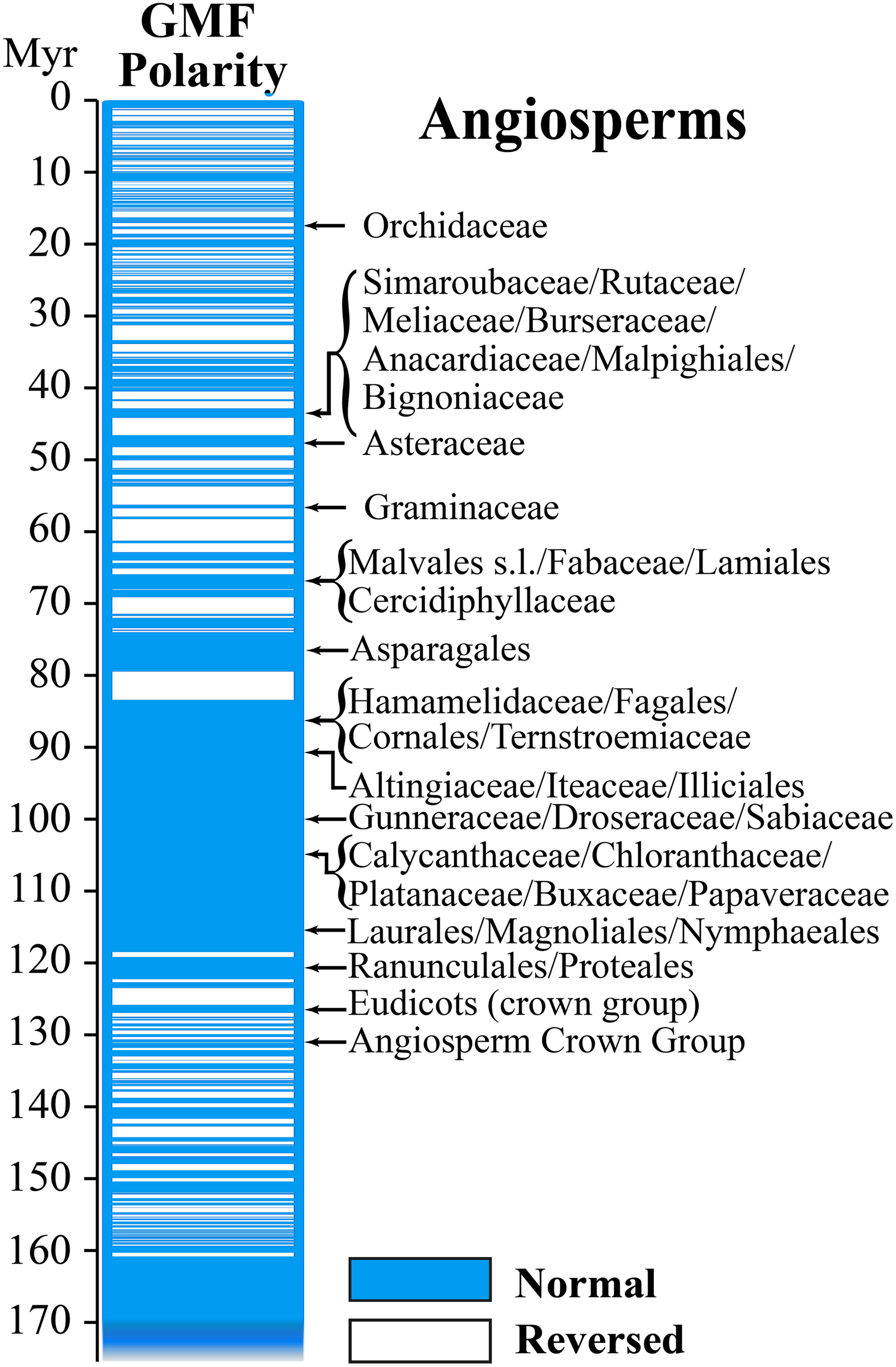 Figure 2. Geomagnetic field reversals and Angiosperm evolution. In the direct comparison of GMF polarity and diversion of Angiosperms it is interesting to note that most of the diversion occurred during periods of normal magnetic polarity (Modified from Occhipinti et al., 2014).