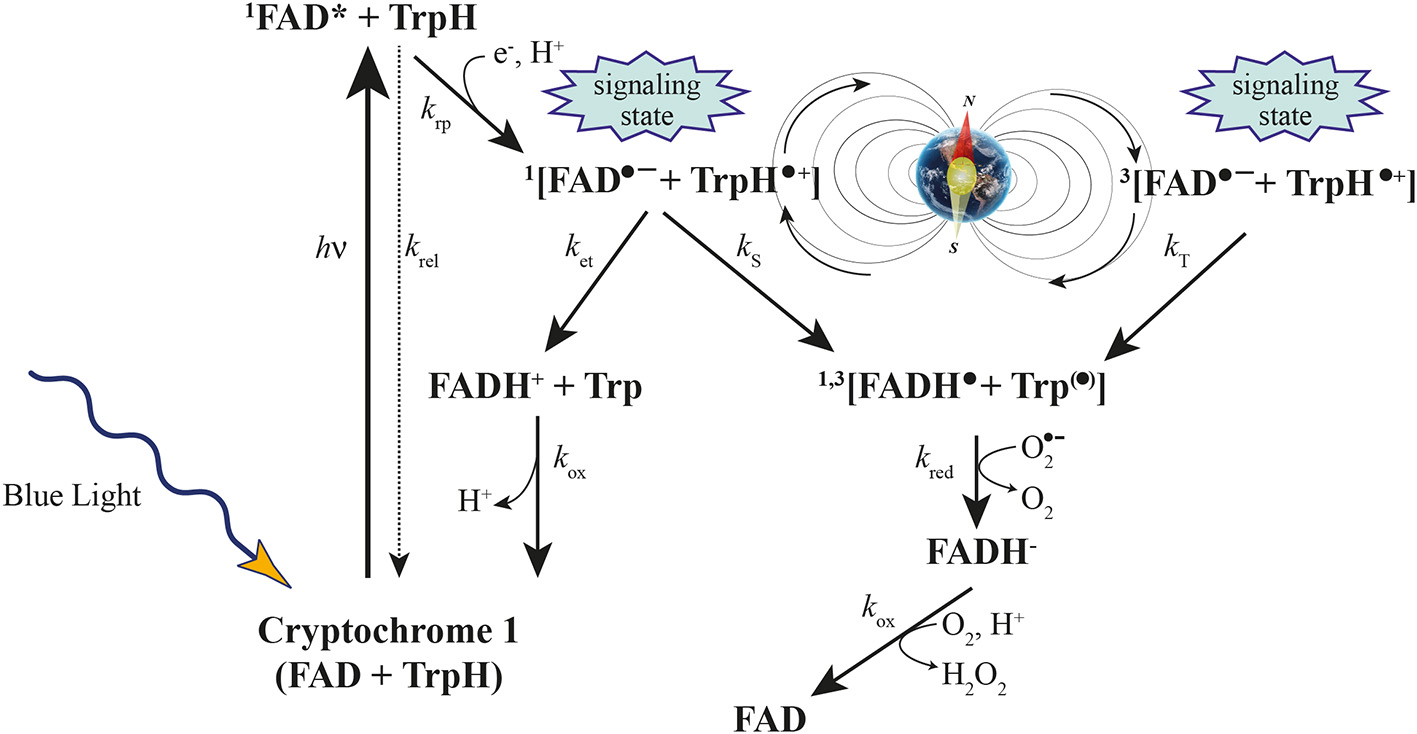 Figure 3. Cryptochrome activation and inactivation reactions. Blue light activates cryptochrome through absorbing a photon by the flavin cofactor. FAD becomes promoted to an excited FAD* state and receives an electron from a nearby tryptophan, leading to the formation of the [FADH• + Trp•] radical pair, which exists in singlet (1) and triplet (3) overall electron spin states by coherent geomagnetic field-dependent interconversions. Under aerobic conditions, FADH• slowly reverts back to the initial inactive FAD state through the also inactive FADH− state of the flavin cofactor (Modified from Occhipinti et al., 2014).