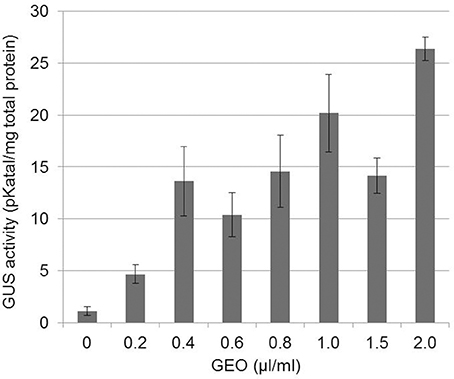 Figure 1. Dose-dependent induction of PR1::GUS gene by GEO foliar treatments. PR1::GUS Arabidopsis leaves were treated with various concentrations of GEO. GUS activity was determined 48 h after the treatment. Three independent biological experiments were performed for each condition. Bars: standard error to the mean.