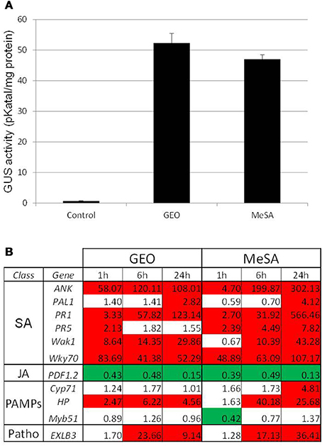 Figure 3. GEO and MeSA show similar activity on defense gene expression. PR1::GUS Arabidopsis leaves were treated with GEO or MeSA solution at 1 μl/ml. GUS activity (A) was analyzed 48 h after treatments and defense gene expression (B) was analyzed by Q-PCR 1, 6, and 24 h post-treatments. Control plants were treated with a solution containing the wetting agent.