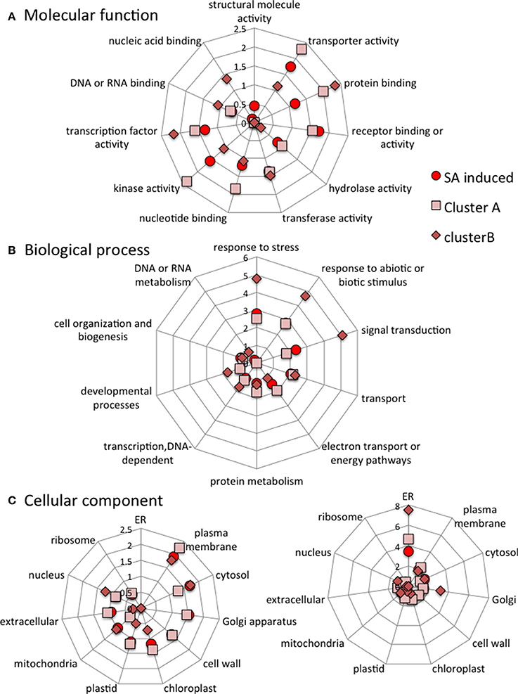 When compared to all SA-induced genes, cluster A is poor in genes involved in “response to abiotic or biotic stress” biological processes and has less “structural molecule activity” but more “nucleic acid binding” molecular functions. Cluster B is enriched in genes involved in “response to stress,” “response to abiotic and biotic stress” and “signal transduction” biological processes. Cluster B is also depleted in “nucleotide binding” and “transcription factor activity,” but is enriched in “protein binding” molecular functions. Cluster B is enriched in “endoplasmic reticulum” and “Golgi” cellular components but depleted in “cell wall,” “extracellular” and “ribosome” cellular components (Figure 8).