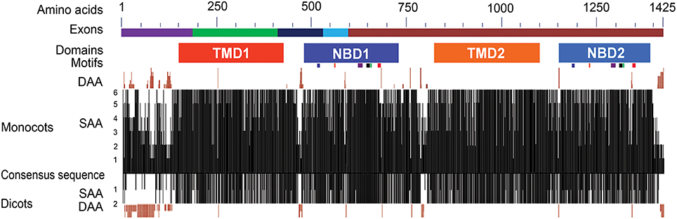 Figure 2. Structural features and sequence similarity of the predicted ABCB1 proteins. The sequence differences in NBDs and TMDs between two halves of ABCB1 proteins are depicted with shades of different colors. The exons marked with different colors above the consensus sequence are drawn according to that of maize. The six known motifs (from left to right in each NBD—Walker A, Q-loop, ABC transport signature, Walker B, D-loop, and H-loop motifs) are depicted as colored boxes under each of NBD1 and NBD2. The presence of similar amino acids against consensus sequence was plotted on a scale of 1–6 in monocots and 0–2 in dicots. The deletions of aa in different species compared to consensus sequence were marked on either side of the similarity plot. DAA and SAA refer to deleted and similar amino acids.