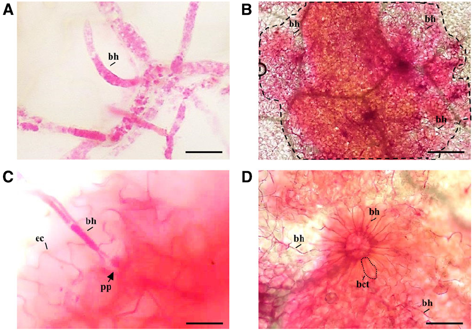 Specific Arabidopsis PME isoforms are induced during B. cinerea infection in Arabidopsis leaves (Raiola et al., 2011; Lionetti et al., 2012). RR was used here to detect PME activity at histopathological level, in infected leaves following B. cinerea infection. Surprisingly, RR strongly stained Botrytis mycelium. The dye seems to accumulate in intracellular vesicular bodies, most likely staining fatty acid in lipid droplets and/or DNA in nuclei but the precise subcellular localization requires further studies (Figure 1A). The staining of the infected leaves with RR showed a strong fuchsia coloration restricted to the lesion areas where the mycelium mainly accumulates respect to a more clearer background observed far from the necrotized zones in the same tissue (Figure 1B). At the level of hypha penetration, the staining can be observed both in CW of epidermal cells like also in a more diffused and strong coloration, probably due to a sum of staining of the deeper multilayer of mesophyll cells (Figure 1C). This evidence indicates RR dye as a useful tool to simultaneously monitoring PME activity and growth of fungal hyphae in plant tissue and giving the opportunity to explore physiological phenomena. For example, in Figure 1D, fungal hyphae exploit the intercellular spaces of fuchsia stained basal cells of a detached trichome to penetrate in the leaf tissue.