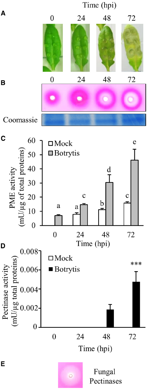 PME activity in total protein extract of WT Arabidopsis plants during Botrytis cinerea infection. (A) Leaves of Arabidopsis plants at different hours post B. cinerea inoculation. (B) Radial gel diffusion assay showing PME (fuchsia halo) and pectinase (inner clear halo) activities in proteins extracted from uninfected and infected leaves. Two μg of total proteins, quantified using Bradford protein assay method, were loaded in each well. Coomassie blue stained gel is shown as loading control. Quantification of (C) PME and (D) pectinase activity in protein extracts from uninfected and infected leaves. Data represent average ± standard deviation of a representative experiment (number of leaves = 6). The experiment was repeated three times with similar results. The different letters reported on the bars in C indicate data sets significantly different according to ANOVA followed by Tukey’s test (P < 0.05). Asterisks in D indicate significant differences in pectinase activity between 48 and 72 hpi according to Student’s t-test (***P < 0.001). (E) Clear halo produced by loading a polygalacturonase from Aspergillus Japonicum. Mock, protein extracts from mock-inoculated leaves; Botrytis, protein extracts from Botrytis inoculated leaves; mU, milliunits; hpi, hour post inoculation.