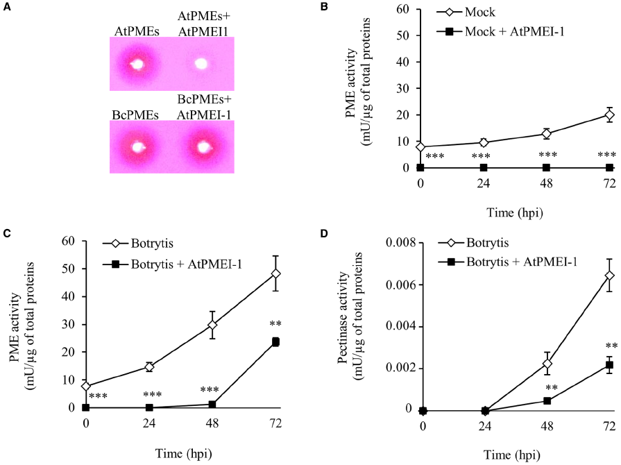 Effect of exogenous addition of recombinant AtPMEI-1 on PME and pectinase activity. (A) ATPMEI-1 expressed in Pichia pastoris and purified to homogeneity was exogenously added to the proteins extracted from WT leaves and to a culture filtrate of B. cinerea enriched in PME activity. Inhibitory effect of AtPMEI-1 on pectinase and PME activity in protein extracts from (B) mock treated and (C,D)B. cinerea inoculated Arabidopsis leaves. Data represent average ± standard deviation of a representative experiment (number of leaves = 3). Asterisks indicate significant differences between ATPMEI-1-treated and untreated extracts according to Student’s t-test (**P < 0.01; ***P < 0.001). The experiment was repeated three times with similar results. Mock, protein extracts from mock-inoculated leaves; Botrytis, protein extracts from Botrytis inoculated leaves; + AtPMEI-1, addition of AtPMEI-1 to the relative protein extract; mU, milliunits; hpi, hour post inoculation.