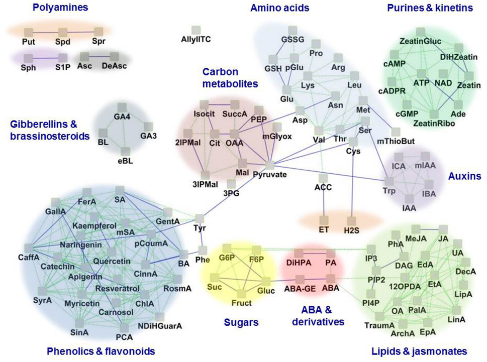 Figure 1. The guard cell metabolome. Based on available literature, 109 known metabolites in guard cells are represented as a network based on their structural and biochemical relationships. Solid blue lines represent KEGG pathway-based biochemical relatedness and green dotted lines represent the Tanimoto structural-index based relatedness, which were inferred using the MetaMapR tool (http//dgrapov.github.io/MetaMapR/) and were visualized using Cytoscape (http://www.cytoscape.org/). The clusters of metabolites are highlighted based on metabolic categorization. Abbreviations of metabolites are as follows: ABA, Abscisic acid; ABA-GE, Abscisic acid glucose ester; ACC, 1-Amino cyclopropane-1-carboxylic acid; Ade, Adenine; ArchA, Arachidonic acid; Arg, L-Arginine; Asc, Ascorbic acid; Asn, L-Asparagine; Asp, L-Aspartic acid; ATP, Adenosine triphosphate; AllylITC, Allylisothiocyanate; BA, Benzoic acid; BL, Brassinolide; cADPR, Cyclic adenosine diphosphate ribose; CaffA, Caffeic acid; cAMP, Cyclic adenosine monophosphate; ChlA, Chlorogenic acid; CinnA, trans-Cinnamic acid; Cit, Citric acid; Cys, L-Cysteine; DAG, 1,2-Diacylglycerol; DAsc, Dehydroascorbate; DecA, Decanoic acid; DiHPA, Dihydrophaseic acid; eBL, Epibrassinolide; EdA, Eicosadienoic acid; EpA, Eicosapentaenoic acid; ET, Ethylene; EtA, Eicosatrienoic acid; FerA, Ferulic acid; F6P, Fructose-6-phosphate; Fruct, Fructose; GallA, Gallic acid; GA3, Gibberellic acid A3; GA4, Gibberellic acid A4; GentA, Gentisic acid; Glu, L-Glutamic acid; Gluc, Glucose; G6P, Glucose-6-phosphate; GSH, Glutathione (reduced); GSSG, Glutathione (oxidized); His, L-Histidine; H2S, Hydrogen sulfide; IAA, Indole-3-acetic acid; IBA, Indole-3-butyric acid; ICA, Indole-3-carboxylic acid; I3P, Inositol-1, 4, 5-trisphosphate; 2IPMal, 2-Isopropylmalic acid; 3IPMal, 3-Isopropylmalic acid; Isocit, DL-Isocitric acid; JA, Jasmonic acid; Leu, L-Leucine; LinA, Linoleic acid; LipA, α-Lipoic acid; Lys, L-Lysine; Mal, L-Malic acid; MeJA, Methyl jasmonate; Met, L-Methionine; mGlyox, Methylglyoxal; mIAA, Methyl indole-3-acetate; mSA, Methyl salicylate; mThioBut, α-keto-γ-(methyl-thio) Butyric acid; mSA, Methyl salicylic acid; NAD, Nicotinamide adenine dinucleotide; NDiHGuarA, Nor dihydro guaiaretic acid; OA, Oleic acid; OAA, Oxalo acetic acid; OlAEE, Oleic acid ethyl ester; 12OPDA, 12-oxophytodienoic acid; cGMP, Guanosine-3′,5′-cyclic monophosphate; PA, Phaseic acid; PalA, Palmitic acid; PCA, Protocatechuic acid; pCoumA, p-Coumaric acid; PEP, Phosphoenolpyruvate; 3PG, 3-Phosphoglycerate; PhA, Phosphatidic acid; pGlu, L-Pyroglutamic acid; Phe, L-Phenylalanine; Pinitol, D-Pinitol; PI3P, Phosphatidylinositol-3-phosphate; PI4P, Phosphatidylinositol-4-phosphate; PIP2, Phosphatidylinositol-4, 5-bisphosphate; Pro, L-Proline; Put, Putrescine; RosmA, Rosmarinic acid; SA, Salicylic acid; Ser, L-Serine; SinA, Sinapinic acid; S1P, Sphingosine-1-phosphate; Sph, D-erythro-Sphingosine; Spd, Spermidine; Spr, Spermine; Suc, Sucrose; SuccA, Succinic acid; SyrA, Syringic acid; Thr, L-Threonine; TraumA, Traumatic acid; Trp, L-Tryptophan; Tyr, L-Tyrosine; UA, Undecanoic acid; Val, L-Valine; Zeatin, trans-Zeatin; ZeatinGluc, trans-Zeatin glucoside; ZeatinRibo, trans-Zeatin riboside.
