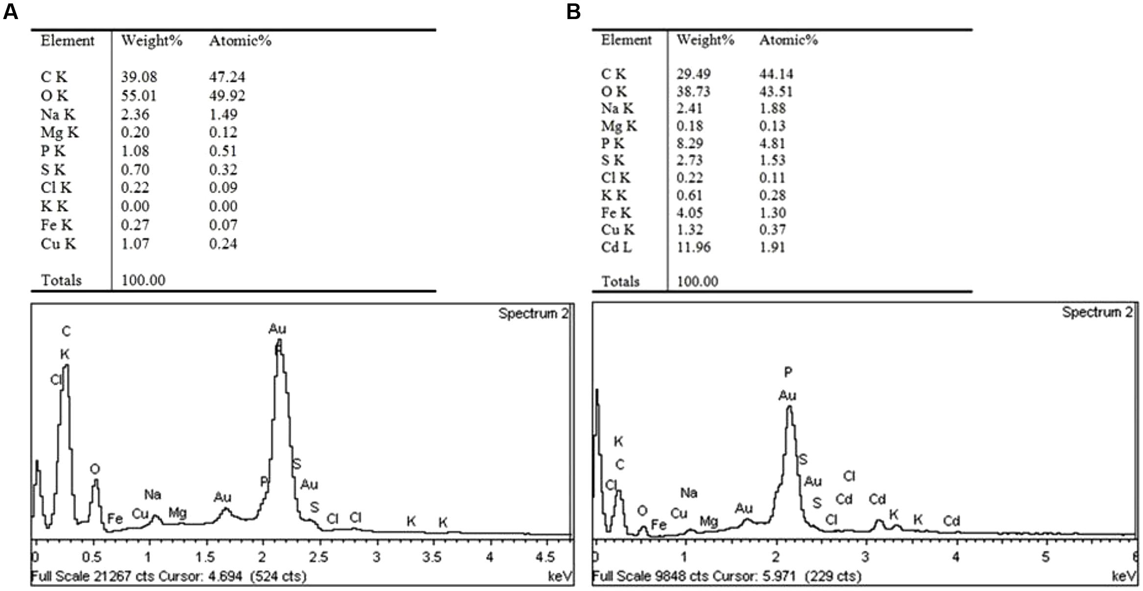 To better understand the Cd tolerance of FS10-C its morphological changes under different Cd treatments were investigated using SEM (Figure 3). The results suggested that there was no significant influence on FS10-C growth in the 10 mg L-1 Cd treatment compared with the control, although a small irregular fold emerged on the surface of FS10-C mycelia in the 100 mg L-1 Cd treatment. Furthermore, EDX analysis showed that the peaks of the four nutrient elements P, S, K, and Fe increased (Figure 4).