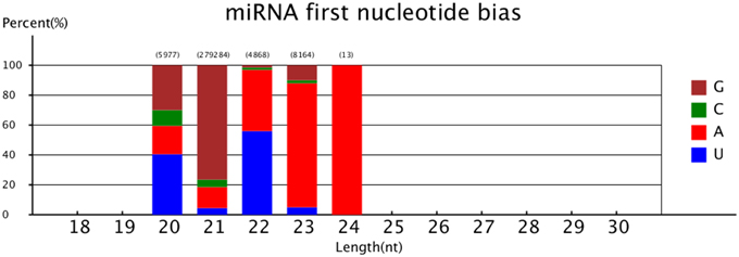 The first nucleotide bias of the different lengths' novel miRNA was also analyzed. The results showed that > 40% miRNAs of 20 and 22 nt began with 5′ uridine, and only <5% miRNAs of 20 and 23 nt began with 5′ uridine (Figure 3).