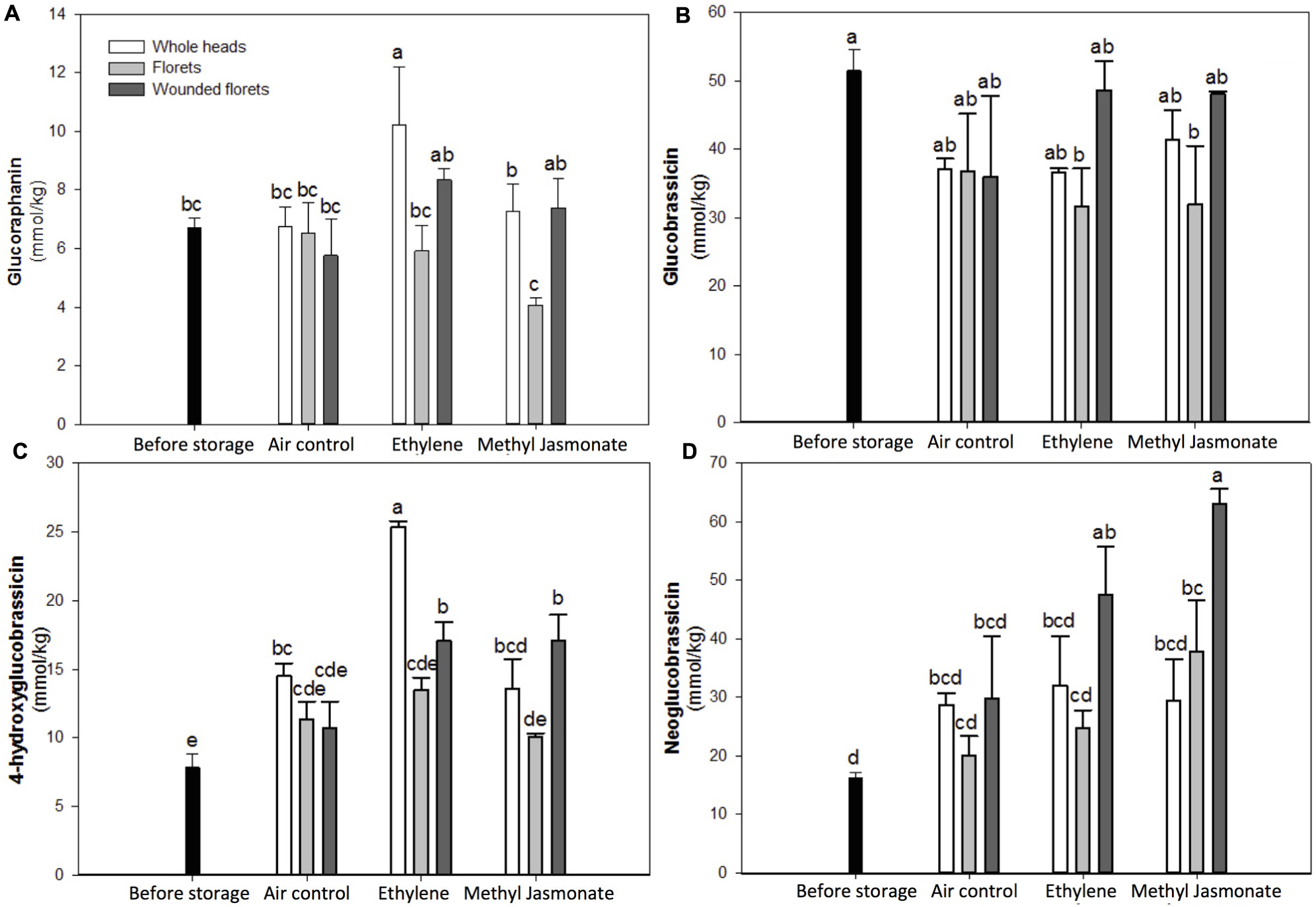 FIGURE 5. Effect of wounding and exogenous ET and MeJA on the concentration of glucoraphanin (A), glucobrassicin (B), 4-hydroxyglucobrassicin (C), and neoglucobrassicin (D) of broccoli stored for 24 h at 20°C. Data represent the mean of three repetitions and their standard errors. Data reported for samples before storage represent values of time 0 h whole heads. Bars with different letters indicate statistical difference by the LSD test (p < 0.05).