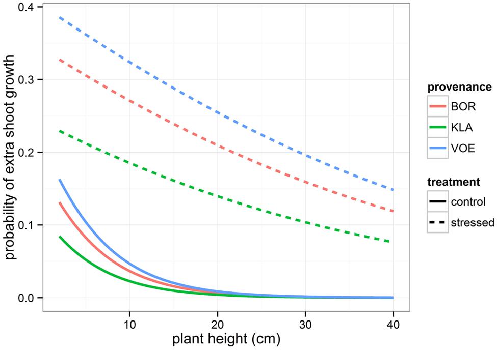 In addition, the higher the height at the end of the drought treatment, the lower the probability on extra shoot growth (Table 2, Figure 4).
