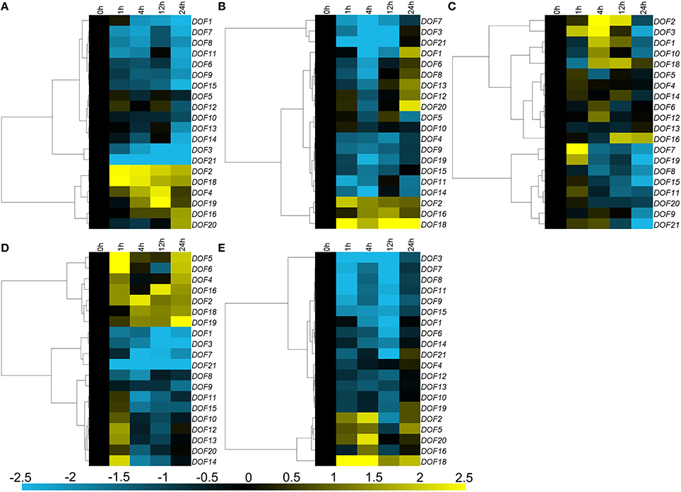 Figure 6. Differential transcription of CmDOF genes in leaves as induced by (A) salinity stress, (B) moisture stress, (C) low temperature (4°C), (D) high temperature (40°C), and (E) wound treatments. Blue and yellow indicate lower and higher transcript abundance, respectively, compared to the relevant controls.