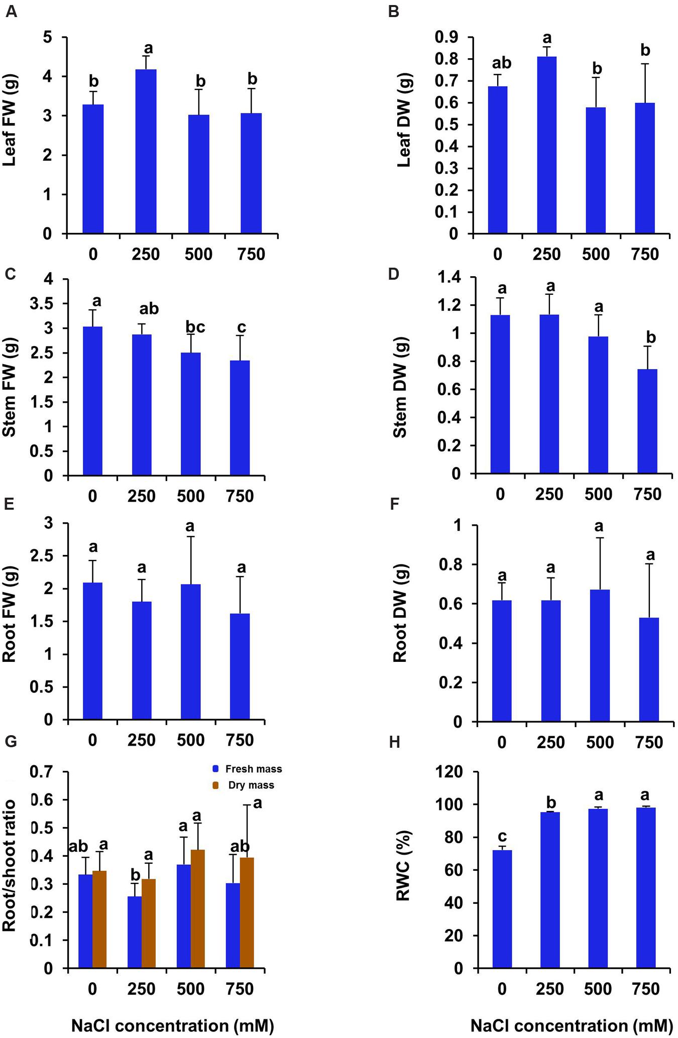 FIGURE 2. Salinity induced changes in biomass and leaf relative water contents in S. persica after 21 days of salt treatment. (A) Leaf FW; (B) Leaf DW; (C) Stem FW; (D) Stem DW; (E) Root FW; (F) Root DW; (G) Root/shoot ratio and (H) RWC (%). The values are mean ± SD (n = 5). The different letters on the top of the error bars indicate statistically different means at P ≤ 0.05.