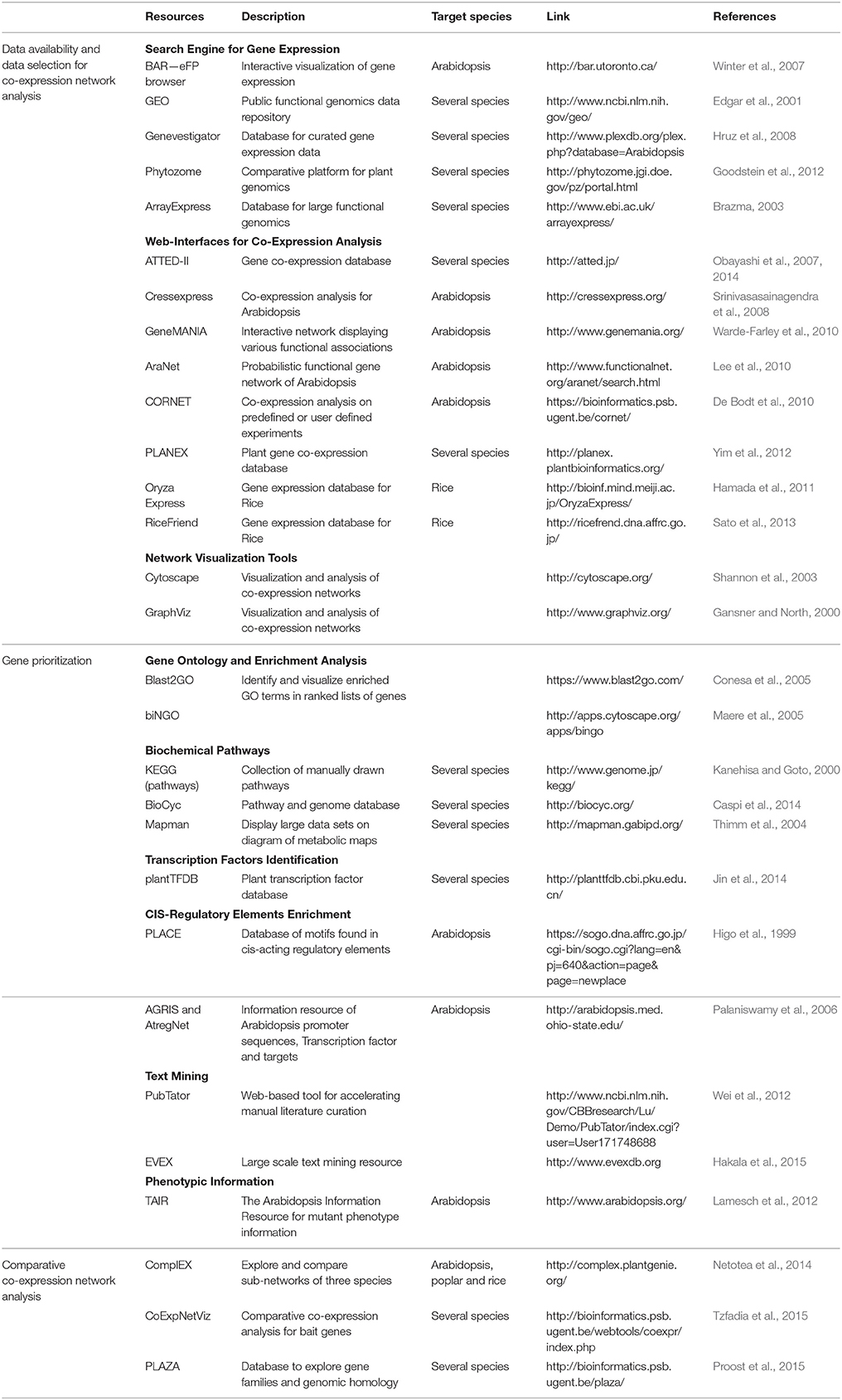 Once a co-expression network is obtained, biological relevant information can be mined by gene prioritization. This process consists of integrating diverse data sources to allow the ranking of the nodes in the network and to identify groups of functionally related genes, down to important putative regulatory genes. A panel of databases and tools are available to facilitate the integration of gene information in the network (Table 1).