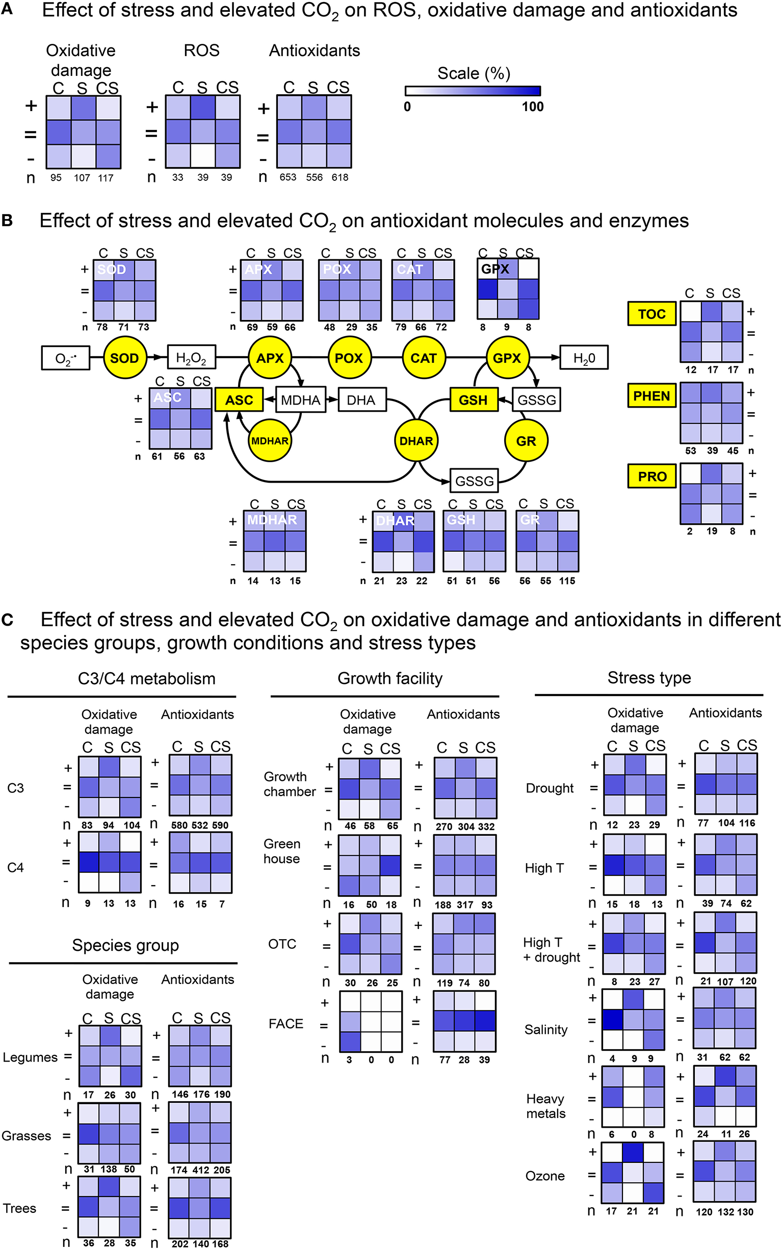 Heat maps showing the relative numbers of observations (%), demonstrating the effect (increase “+, ”no change “ =, ” decrease “−”) of elevated CO2 (C), stress (S), and their combination (CS), on oxidative damage and antioxidants. (A) Comparing overall effects on oxidative damage, ROS and antioxidants. (B) Effects individual antioxidant components. (C) Effects categorized by metabolism type, species group, growth conditions and stress type.