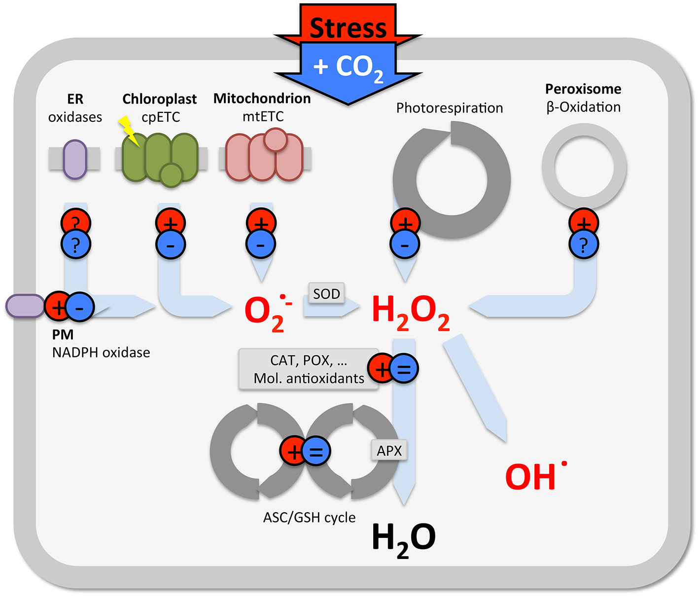 Schematic view summarizing the predominant effect of stress (red) and elevated CO2 (blue) on ROS production in various subcellular locations. Note, there is considerable variety in the outcome of studies on antioxidants (see text), only the predominant effects are indicated in this generalization.