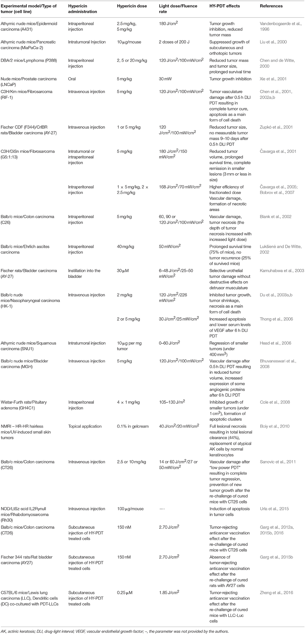 However, instead of more clinically relevant orthotopic tumor models, more in vivo studies have been performed to test the efficacy, conditions or responses of HY-PDT after the treatment, only in the murine or rat xenograft or allograft models of subcutaneous carcinomas or sarcomas. Various positive effects of HY-PDT involving the inhibition of tumor growth, a prolonged survival time of the treated animals, tumor necrosis, apoptosis or damage to the tumor vasculature were observed in mice bearing human epidermoid carcinoma (Vandenbogaerde et al., 1996), human prostate adenocarcinoma cells (Xie et al., 2001), human nasopharyngeal carcinoma cells (Du et al., 2003a,b; Thong et al., 2006), human squamous carcinoma cells (Head et al., 2006), human bladder carcinoma cells (Bhuvaneswari et al., 2008), human rhabdomyosarcoma cells (Urla et al., 2015), murine lymphoma cells (Chen and de Witte, 2000), murine colon adenocarcinoma cells (Blank et al., 2002; Sanovic et al., 2011), murine fibrosarcoma cells (Čavarga et al., 2001, 2005; Chen et al., 2001, 2002a,b; Bobrov et al., 2007) or murine Ehrlich ascites carcinoma cells (Lukšienė and De Witte, 2002) and in rats bearing rat bladder transitional bladder carcinoma (Zupkó et al., 2001) or rat pituitary adenoma cells (Cole et al., 2008) (Table 2). In addition, Blank et al. (2002) demonstrated the dependence of HY-PDT efficacy on the irradiation conditions (light dose and wavelength). Tumor necrosis was much more pronounced at 590 nm than at 550 nm and even increased when the light dose was raised from 60 to 120 J/cm2; however, the maximum depth of tumor necrosis was 9.9 ± 0.8 mm at 590 nm (Blank et al., 2002). Considering the relationship between HY-PDT efficacy and tumor volume, similar results were obtained in other studies. Head et al. (2006) and Cole et al. (2008) observed a regression or reduction in tumor size only in tumors smaller than 0.4 or 1 cm3, respectively, whereas larger tumors showed only a partial response followed by their regrowth (Head et al., 2006), or did not respond to the treatment (Cole et al., 2008). Thus, light penetration into the tissue appeared to be a limiting factor. However, Cole et al. (2008) also concluded that HY-PDT can be effective in the elimination of small solid tumor residues. Čavarga et al. (2001) also determined complete remission only in smaller tumors (3 mm or less in height), but the main aim of their study was to compare the impact of intraperitoneal and intratumoral hypericin injection on the effectiveness of HY-PDT. Both schedules of hypericin administration significantly reduced tumor volume and increased the survival rate of animals. However, considering the complete response, a higher HY-PDT efficacy was observed for hypericin that was administered intraperitoneally (44.4%) compared to intratumorally (33.3%) (Čavarga et al., 2001). Moreover, it was later demonstrated that a better therapeutic response was obtained after fractionated hypericin administration (two 2.5 mg/kg doses; 6 and 1 h before irradiation) than after a single hypericin dose (5 mg/kg; 1 or 6 h before irradiation) (Čavarga et al., 2005).