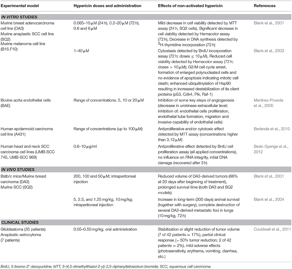 Firstly, Blank et al. (2001) demonstrated the cytotoxic and antiproliferative effect of non-activated hypericin both in vitro and in vivo. Hypericin significantly decreased the viability of highly metastatic murine breast adenocarcinoma (DA3HI) and SCC (SQ2) cells. Moreover, the anticancer potential of hypericin was observed even in vivo in DA3HI- and SQ2-derived tumors. Even though hypericin slightly accelerated death in mice with DA3HI-derived tumor development that was very rapid, intraperitoneal hypericin administration (6 declining doses) in other animals led to the inhibition of tumor growth, which was accompanied by prolonged survival time. Moreover, the hypericin-mediated improvement of survival was also evident in mice with high-grade SCC tumors (Blank et al., 2001). Subsequently, Blank et al. (2004) examined the antimetastatic potential of non-activated hypericin and evaluated its influence on long-term survival (up to 300 days). Again, mice with breast adenocarcinoma or SCC tumors, which develop metastases predominantly in the lungs, were used as experimental models. To evaluate the impact of hypericin only on metastases, primary tumors were surgically excised at a stage when micrometastases already existed. Hypericin was administered intraperitoneally in multiple declining dosages (up to 6 doses of hypericin at 5-day intervals). In both cases of tumor origin, hypericin therapy together with the resection of primary tumors resulted in a significant increase in long-term animal survival compared to the untreated control or to those animals that received surgery alone. Moreover, the complete destruction of several, but not all lung metastases, was evident 72 h after hypericin treatment. The results indicate that a single hypericin dose was insufficient to prolong the survival of animals, but fractionated hypericin doses could prevent animal death when administered shortly after the resection of the primary tumor (Blank et al., 2004). Similarly, multiple hypericin doses were applied in a previous study to obtain positive anticancer therapeutic results (Blank et al., 2001).