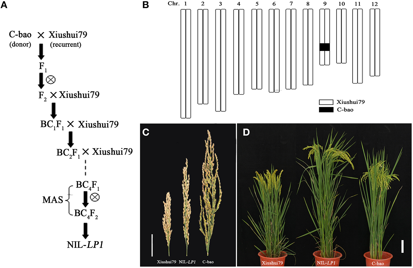 Genotypic and phenotypic performance of the parents. (A) Workflow of the construction of one NIL plant (BC4F2), NIL-LP1. (B) Graphical genotype of NIL-LP1. The black bar indicates the fragment from C-bao, and the remainder was derived from Xiushui79. (C) Panicle morphology of Xiushui79, NIL-LP1 and C-bao. Bar = 5 cm. (D) Xiushui79, NIL-LP1, and C-bao plants. Bar = 10 cm.