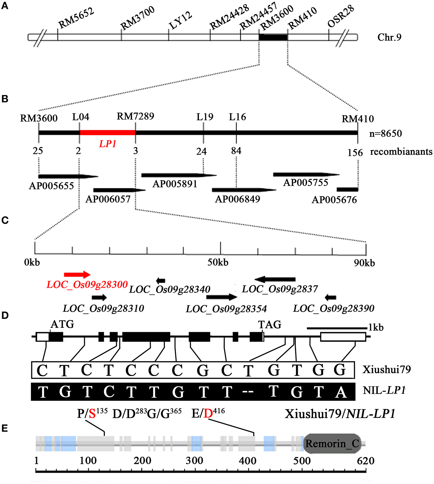 Map-based cloning of LP1. (A) Primary mapping of LP1. LP1 was mapped between the SSR markers RM3600 and RM410. (B) High-resolution mapping of LP1. LP1 was delimited to a 90-kb region between the markers L04 and RM7289 in the BAC clones AP005655 and AP006057, using a total of 8650 plants from the NIL-LP1/Xiushui79 F2 population. (C) Predicted ORFs based on the Nipponbare genome sequence in the Rice Genome Annotation Project database (http://rice.plantbiology.msu.edu/index.shtml). The horizontal arrows indicate the six predicted ORFs. (D) Gene structure of LOC_Os09g28300. The empty boxes refer to the 5′ and 3′ UTRs; the black boxes, to exons; and the lines between the boxes, to introns. The fourteen SNPs in LP1 are indicated by solid lines. (E) The Remorin_C domain predicted in the protein encoded by LOC_Os09g28300. The solid lines indicate the positions of two amino acid transitions.