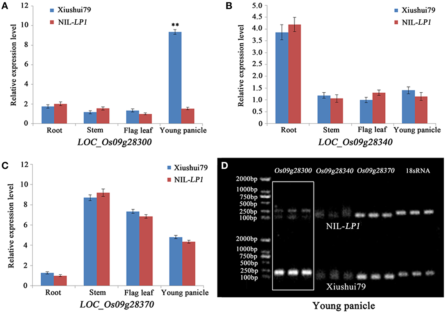 Analysis of the expression of the three expressed candidate genes via real-time quantitative RT-PCR. (A) Relative expression of LOC_Os09g28300 in the roots, stems, flag leaves and young panicles. (B) Relative expression of LOC_Os09g28340 in the roots, stems, flag leaves and young panicles. (C) Relative expression of LOC_Os09g28370 in the roots, stems, flag leaves and young panicles. (D) Real-time quantitative RT-PCR results for the three candidate genes in the young panicles. The 18S rRNA gene was used as a control. ** indicates significance at the α = 0.01 probability level.