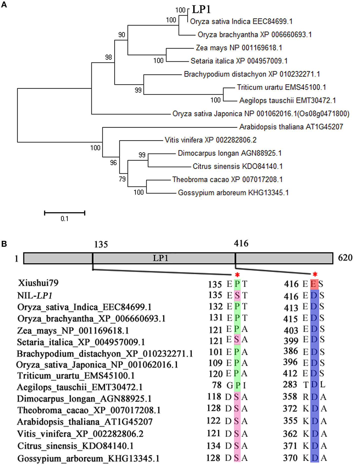 Phylogenetic analysis of the LP1 protein. (A) Phylogenetic tree of the LP1-like proteins in higher plants. The amino acid sequences of 15 LP1 homologs were obtained from NCBI (http://www.ncbi.nlm.nih.gov/) and used to construct a bootstrap N-J phylogenetic tree. A total of 1000 replicates were performed to determine the statistical support for each node. LP1 is denoted in bold. (B) Diagram indicating the two amino acid substitutions in LP1 at positions conserved across LP1-like proteins.