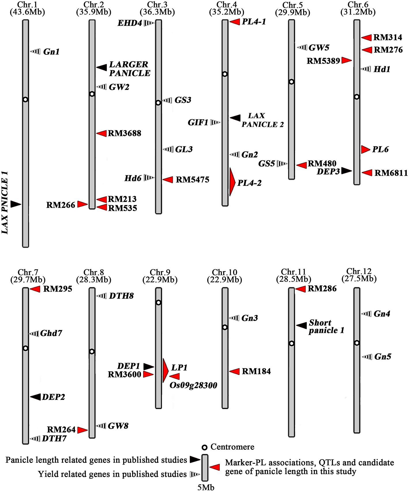 GWA mapping revealed that the SSR marker RM3600 was associated with PL and was located in the region between RM5652 and RM410 of the QTL LP1 detected through linkage analysis in the RILs (Tables 1, 2). The locus explained more than 20% of the variation of panicle length in both the linkage and GWA mapping analyses, indicating that LP1 is a major QTL controlling panicle length in rice.