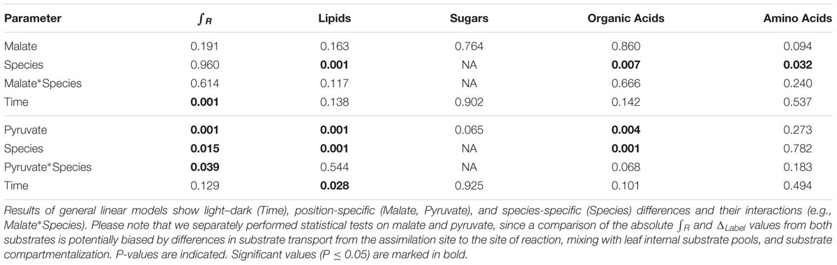 General linear models were performed to test for position-specific, species-specific, and temporal differences in ∫ R and ΔLabel of different metabolic fractions. One-way analysis of variance (ANOVA) and Tukey-HSD post hoc tests were used to show differences in ΔLabel of different metabolic fractions for each 13C-labeled substrate. Unless otherwise specified, means and standard errors are given. All statistical analyses were performed in R (version 3.1.3; R Core Team, 2015).