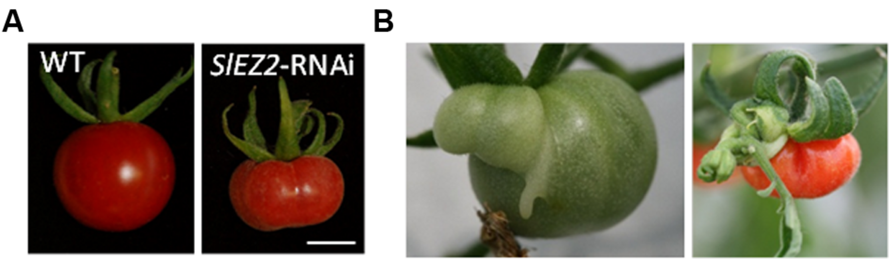 (A) Red ripe SlEZ2-RNAi tomato fruits are characterized by modified shape, colour, and surface aspect (right) compared to the WT fruits (left; bar = 1 cm). (B)SlEZ2-RNAi plants occasionally develop fruits with extra carpels. In some cases ectopic flowers and/or leaves (left) are also observed. (A) Courtesy from P Gallusci and E Teyssier (B) Adapted from Boureau et al. (2016).