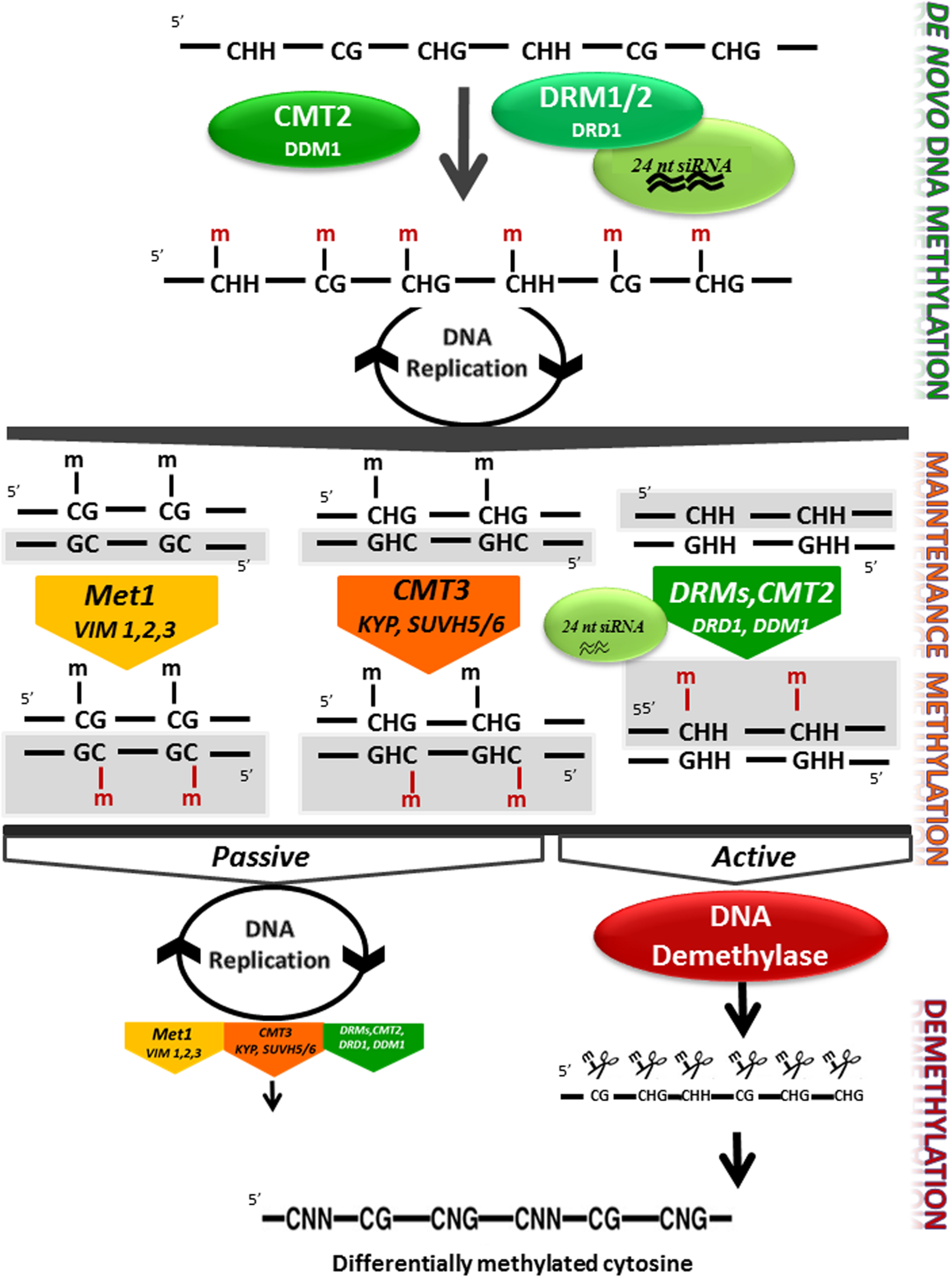 DNA methylation control in plants. Methyltransferases and DNA demethylases are involved in 5mC de novo methylation, maintenance methylation, and demethylation in higher plants. De novo DNA methylation is set up by the RNA directed DNA Methylation (RdDM) pathway involving the DRM1/2 methyltransferases, DRD1 and 24 nt long small RNAs, and by the chromomethylase CMT2 with DDM1 in the CHH sequence context at heterochromatic regions (Zemach et al., 2013). Details of the RdDM pathways are shown in Figure 3. After replication, newly produced DNA will be hemi-methylated at CG and CHG symmetrical sites, but at CHH sites one of the two newly synthesized DNA molecules will not be methylated. Maintenance methylation in the CG context depends on MET1 and VIM1, 2 and 3, and maintenance in the CHG context is catalyzed by CMT3. CHH methylation maintenance depends both on the RdDM pathway and on CMT2 activity. Both CMTs are dependent on histone methylation mediated by KYP and SUVH5 and 6. DNA demethylation can occur passively in a replication dependant way, when the methylation machinery is not or poorly active. 5mC cytosine can be actively removed by DNA glycosylase lyase independently from DNA replication. Newly synthesized DNA strands are highlighted in gray Enzymes names are based on the Arabidopsis model. DRM1/2, CMT2/3 (CHROMOMETHYLASE 2/3), MET1 (cytosine-DNA-methyltransferase 1), VIM1–3 (VARIANT IN METHYLATION 1–3), KYP/SUVH4 [KYP/Su-(var)3–9 homolog 4], SUVH5/6 [Su-(var)3–9 homolog 5/6], DRD1 (DEFECTIVE IN RNA-DIRECTED DNA METHYLATION), DDM1 (DECREASE IN DNA METHYLATION), and 24 nt siRNA (24 nucleotide small interfering RNAs).