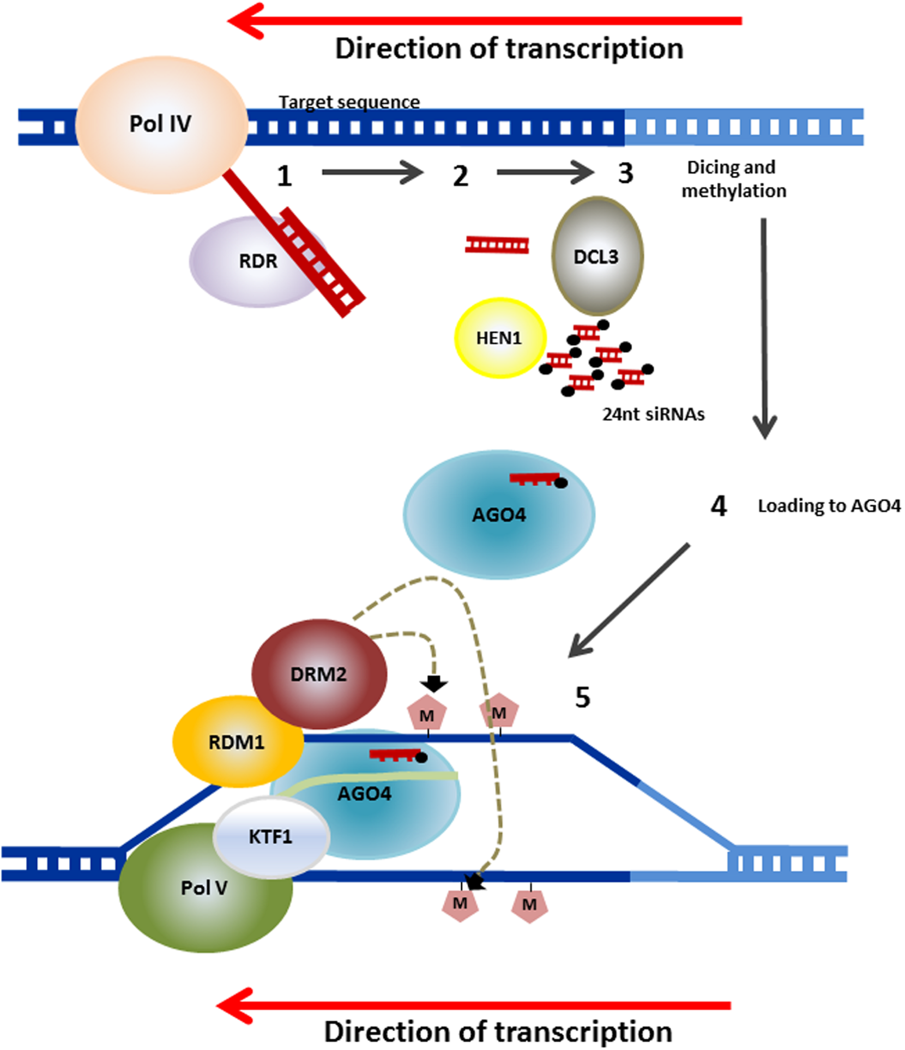 Mechanism for RdDM. RNA transcripts are generated from repetitive sequences (transposons and others) by an RNA polymerase known as Pol IV. RNA-DEPENDENT RNA POLYMERASE (RDR) then converts the RNA to double stranded transcripts. These are processed into 24-nucleotide small RNAs (siRNAs) by DICER-LIKE3 (DCL3). These are methylated at their 3′ ends by HUA ENHANCER 1 (HEN1) and the guide strand complementary to the genomic DNA, that will be the target of the RdDM, is incorporated into ARGONAUTE (AGO4). AGO4 is recruited through interactions with Pol V and with KOW DOMAIN-CONTAINING TRANSCRIPTION FACTOR 1 (KTF1). RNA-DIRECTED DNA METHYLATION 1 (RDM1) links AGO4 and DOMAINS REARRANGED METHYLTRANSFERASE 2 (DRM2), which catalyzes de novo methylation of DNA (after Matzke and Mosher (2014) and Matzke et al. (2015). Several mechanisms for RdRM have been reported to deviate from this canonical pathway and these are also described in the latter reviews.