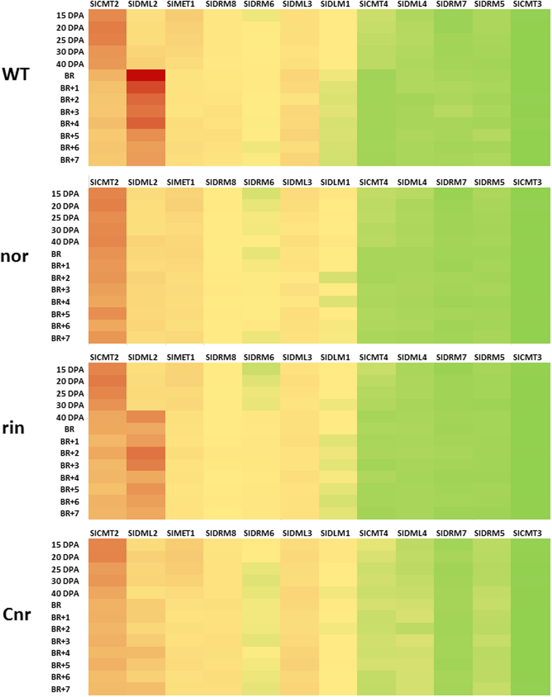 Expression of methyltransferase and DNA demethylase genes in normal and mutant tomato fruits. Heat maps from normalized microarray data (see Liu et al., 2015, Supplementary information) showing expression of methyltransferase and DNA demethylase genes in developing and ripening tomato fruits from Ailsa Craig and near isogenic lines containing the non-ripening (nor), ripening inhibitor (rin), and Colourless non-ripening (Cnr) mutations. Fruits were sampled at 15, 20, 25, 30, and 40 days post anthesis (dpa) and also at breaker (Br) and for 7 days post breaker (BR+1 to BR+7). Forty dpa was taken as mature green and BR+7 was the red ripe stage. The values used to construct the maps were means of three biological replicates (individual fruits) at each stage at for each gene. SlMET1 (Solanum lycopersicon, CYTOSINE-DNA-METHYLTRANSFERASE 1), DML (DNA DEMETHYLASE), DRM (DOMAINS REARRANGED METHYLASE). On the heat map red is for high levels of gene expression and green for low expression. Yellow represents intermediate values.