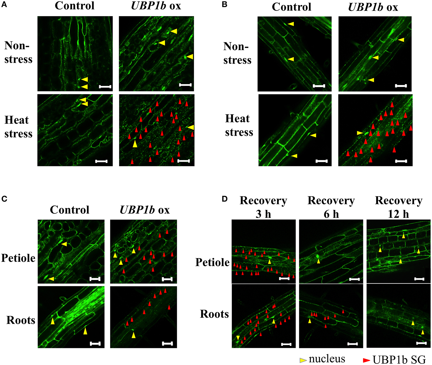 Subcellular localization of UBP1b in plants under normal and heat stress conditions. Red and yellow triangles identify the presence of UBP1b SGs and nuclei, respectively. Scale bar = 50 μm. (A) Localization of UBP1b in the cells of petioles of 2-week-old UBP1b-ox and Venus control plants exposed to non-stress (22°C) and heat stress (40°C for 1 h). (B) Subcellular localization of UBP1b in the root cells of UBP1b-ox and Venus control plants exposed to non-stress (22°C) and heat stress (40°C for 1 h). (C) Subcellular localization of UBP1b in UBP1b-ox and Venus control plants subjected to a mild heat stress (37°C for 1 h) prior to observation. (D) Subcellular localization of UBP1b in petiole and root cells of UBP1b-ox plants after recovery from heat stress. After exposure to 40°C for 1 h, plants were returned to 22°C and maintained for an additional 3, 6, or 12 h prior to observation.