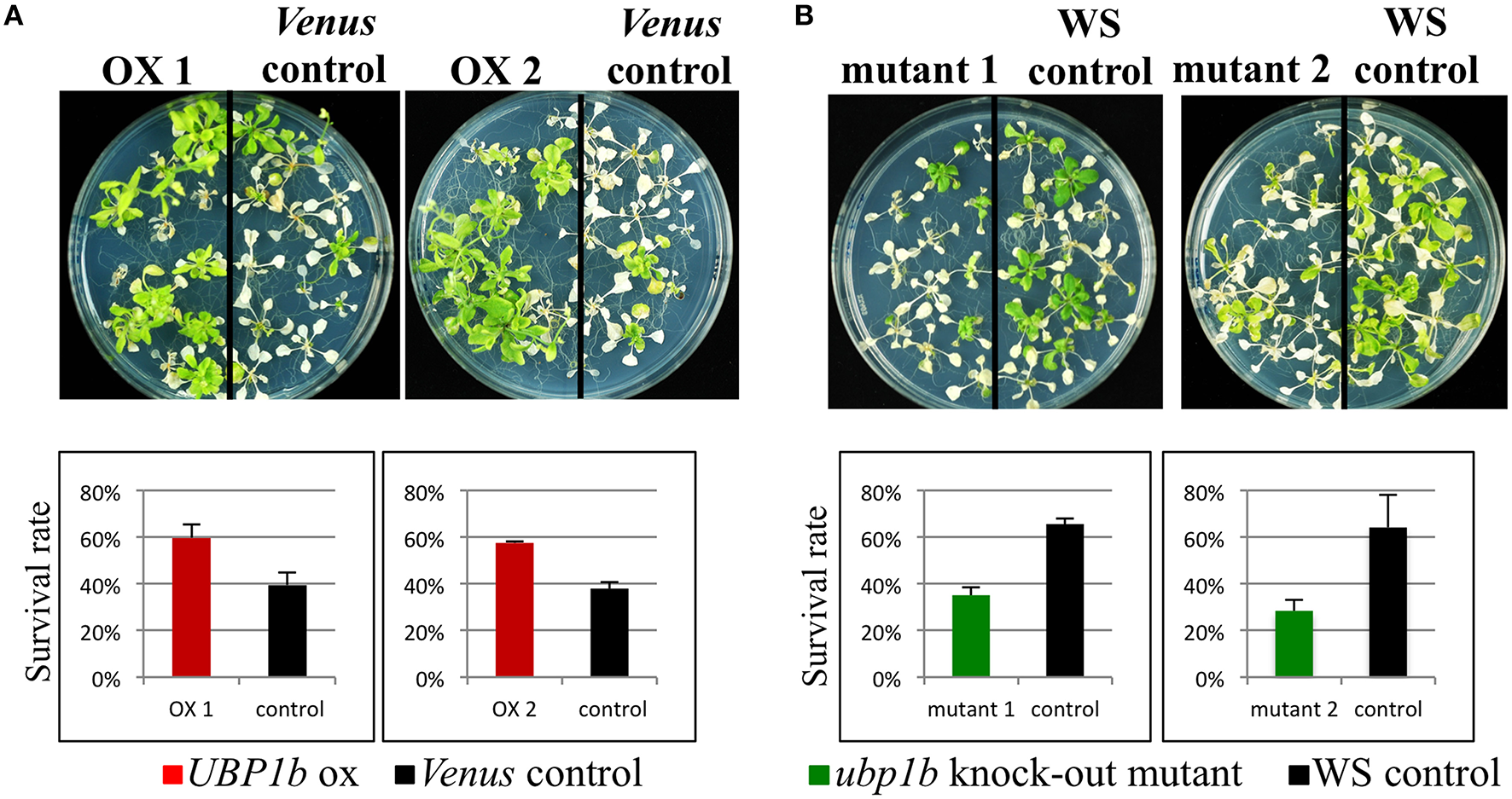 Heat tolerance assay. Two-week-old UBP1b-ox (2 lines: ox 1 and ox 2) and Venus control plants were subjected to 42° C for 3 h, and then grown at 22° C under long-days for 2 weeks prior to assessing plant survival. Twelve seedlings of each line were sown on each plate, and five plates of plants were used in each assay. The assay included three biological replicates. (A) Phenotype and survival rate of UBP1b-ox and Venus control plants at the termination of the heat stress tolerance assay. (B) Phenotype and survival rate of ubp1b mutants and WS control plants at the termination of the heat stress tolerance assay. Y-axis represents the percentage of surviving plants relative to the total number of plants used within each assay. Data represent the mean ± sd of three biological replicates.
