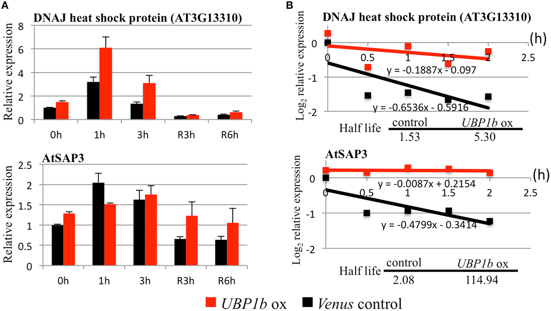 RT-qPCR and mRNA decay analyses of UBP1b target genes. Two UBP1b-targeted mRNAs (a DnaJ heat shock protein, AT3G13310 and a stress-associated protein, AtSAP3) were analyzed in UBP1b-ox (line ox1) and Venus control plants were analyzed. (A) RT-qPCR analysis of UBP1b target genes. Fourteen day-old plants were treated with heat (40°C) for 1, 3 h and then allowed to recover at 22°C for 3 h (R3h) and 6 h (R6h). Total mRNAs were extracted for RT-qPCR analysis. X-axis: time of treatment. Y-axis: relative expression of target mRNAs. Data represent the mean ± sd of three biological replicates. (B) mRNA decay analysis of UBP1b target genes.
