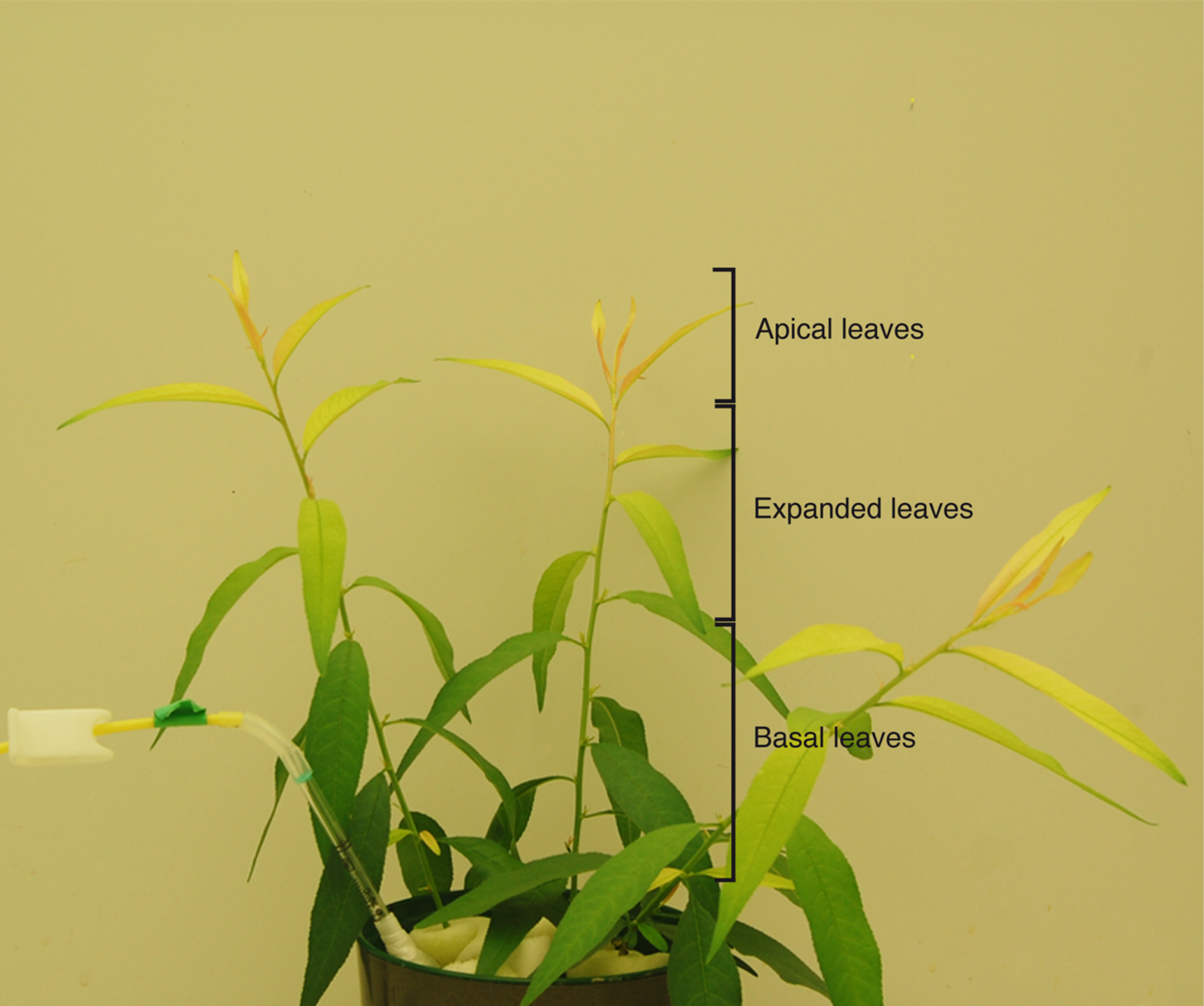 Prunus dulcis × P. persica plants grown in nutrient solution under Fe deficiency for 15 days. Iron-deficiency symptoms include leaf chlorosis. Expanded leaves were those selected to be treated with the Fe foliar fertilizers.