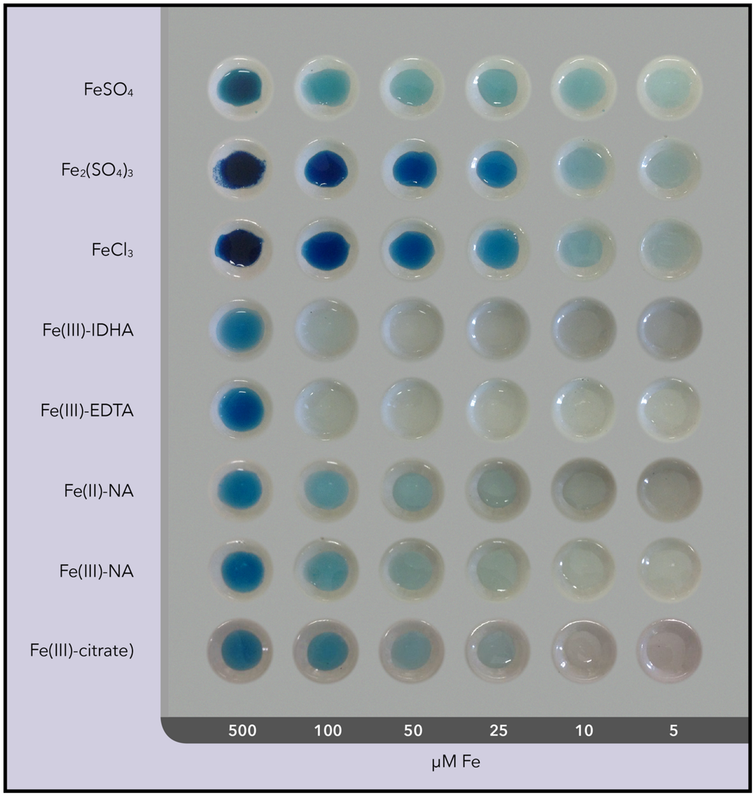 The limits of detection of the Perls blue staining technique were assessed for the different compounds used as foliar fertilizers using porcelain spot plates. Tests included the compounds [FeSO4, Fe2(SO4)3, FeCl3, and Fe(III)-EDTA] in concentrations ranging from 5 μM to 9 mM Fe. The complexes of Fe with nicotianamine (NA), Fe(III)-NA, and Fe(II)-NA, as well as Fe(III)-citrate, were also assayed at the same concentrations. All samples (200 μL) were placed in plate wells, 20 μL of Perls dye (in 2% HCL) was added and mixed, and the blue color was developed for 20 min.