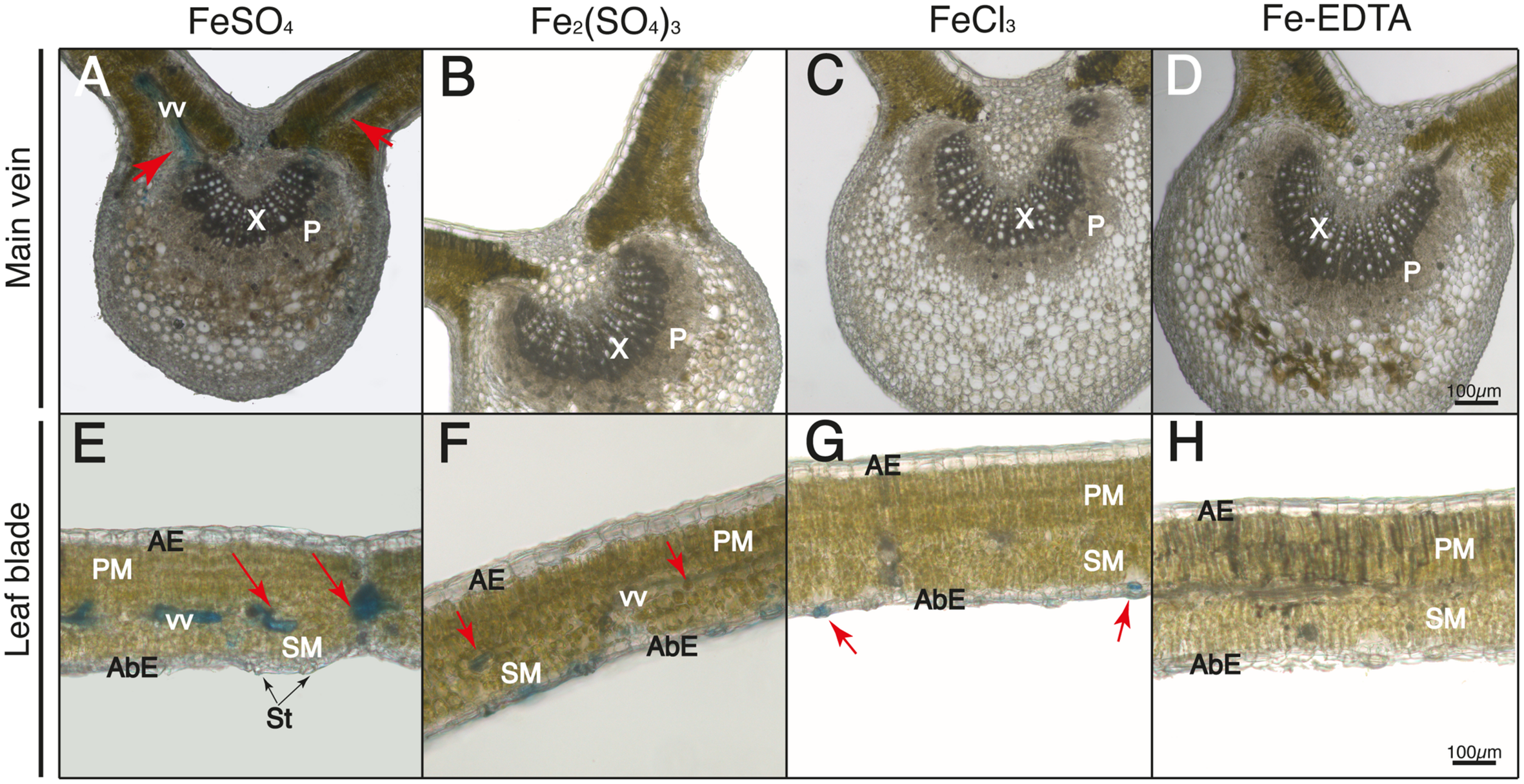 Localization of labile Fe pools using Perls blue staining in transversal leaf sections taken 24 h after Fe foliar fertilization: main vein (A–D) and leaf blades (E–H) Leaves were treated with FeSO4(A,E), Fe2(SO4)3(B,F), FeCl3(C,G), and Fe(III)-EDTA (D,H). Phloem and xylem tissues (P and X, respectively) and vascular vessels (VV) are marked in images (A–D); abaxial and adaxial epidermis (AbE and AE), parenchima and spongy mesophyll tissue (PM and SM), stomata (St) and vascular vessels (VV) are marked in images (E–H). Scale bars correspond to 100 μm.