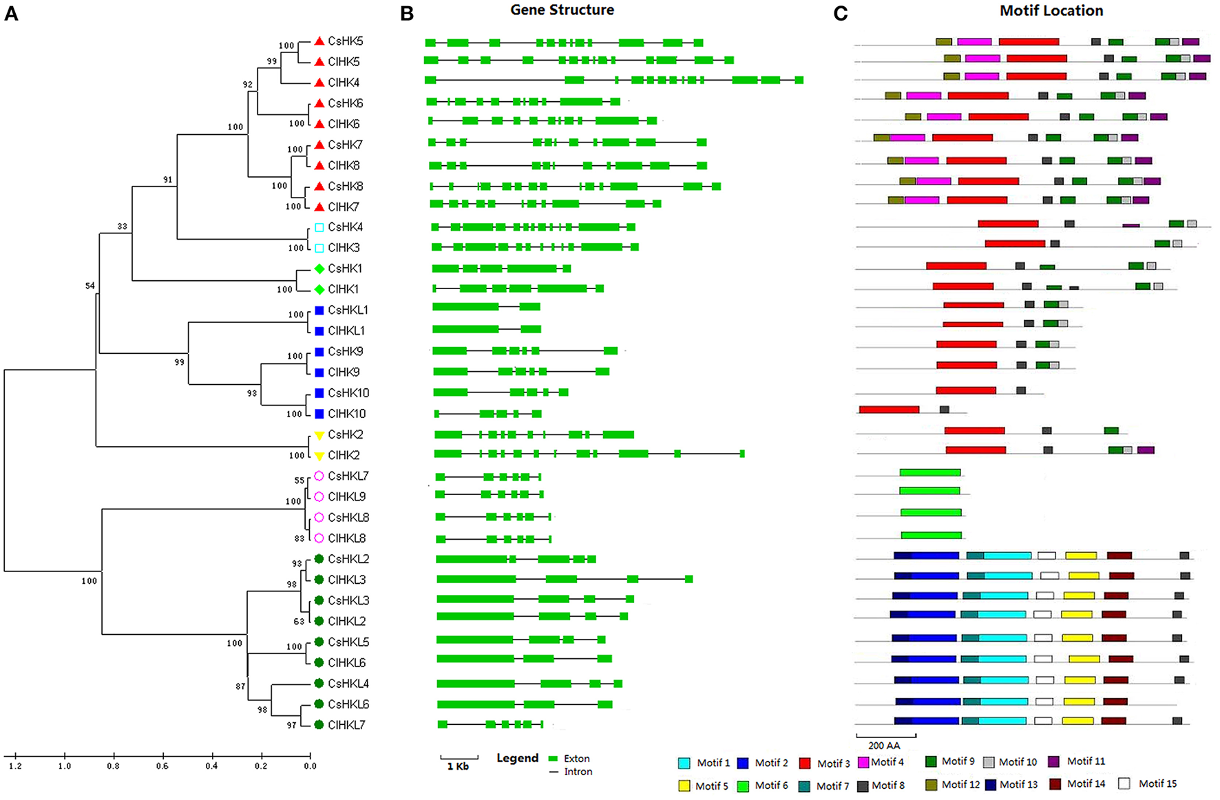 Phylogenetic relationship, gene structures, and conserved motif of all HK(L) genes in cucumber and watermelon. (A) The unrooted phylogenetic tree was generated based on the amino acid sequences by the neighbor-joining method using MEGA 5. Bootstrap supports from 1000 replicates are indicated at each branch. The different subgroup members were marked by different graphs. (B) Gene structure was analyzed using the Gene Structure Display Server online. The green boxes indicate the exons, and lines indicate the introns. (C) Motif analysis was performed using MEME 4.0 software as described in the Materials and methods. The different colored boxes represent different motifs in the corresponding position of each CsHK(L) proteins.