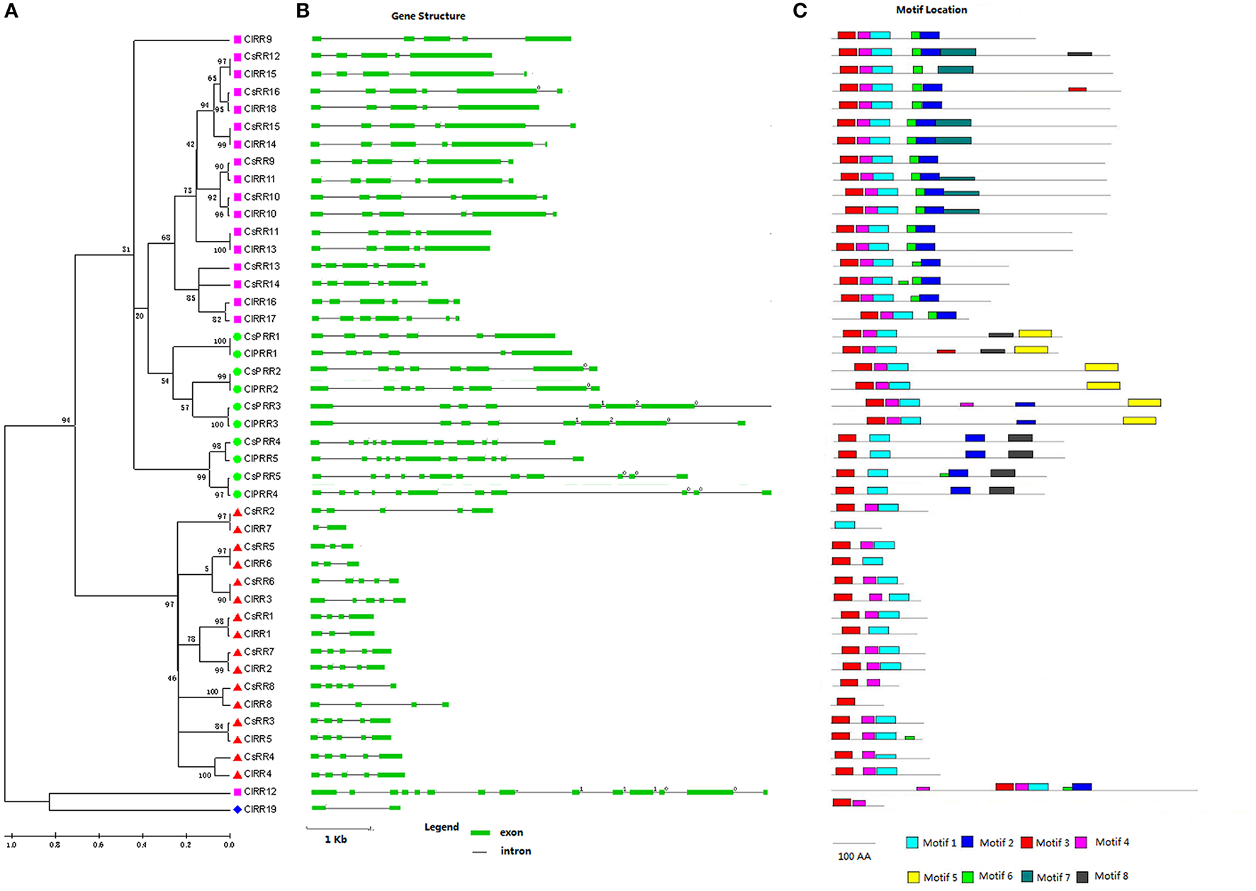 Phylogenetic relationship, gene structures, and conserved motif of RR genes in cucumber and watermelon. For the details, see Figure 1.