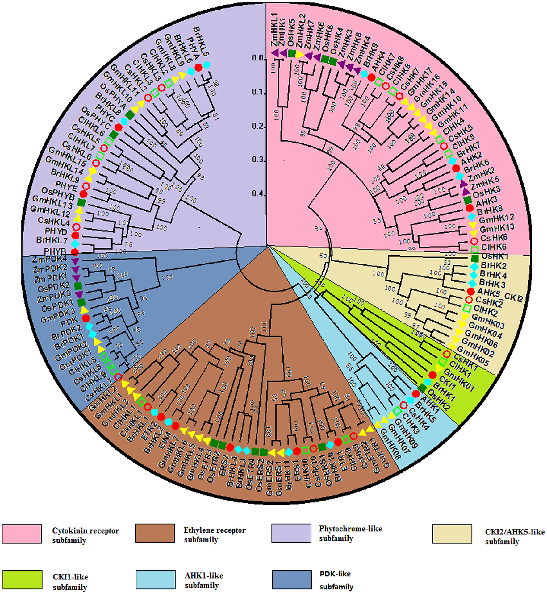Phylogenetic relationship of HK(L) proteins in Arabidopsis, rice, maize, Chinese cabbage, soybean, cucumber, and watermelon. The phylogenetic trees were constructed using the neighbor-joining method with bootstrap tests by MEGA 5.0. The bar represents the relative divergence of the sequences examined. Different subgroups of HK(L)s were highlighted by different colors.