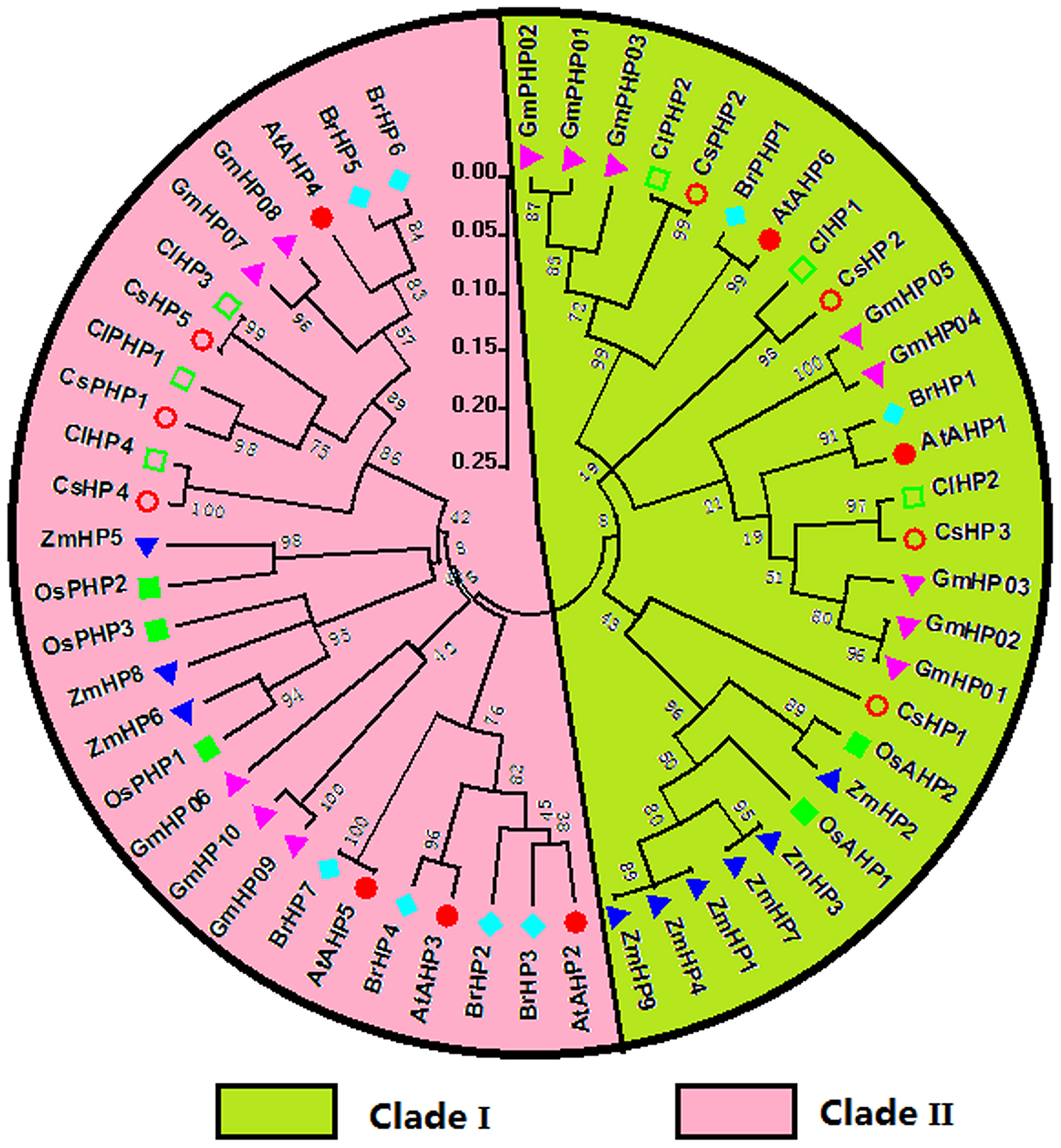 All the authentic and pseudo-HPs from these seven species as above mentioned were mainly divided into two clades, namely clade I and II (Figure 5). In the clade I, dicots HPs, except CsHP1, form a subclade distinct from that of monocots, which indicated this subgroup HPs expand prior to the monocot-eudicot divergence. CsHP1-3 and ClHP1-2 are closely related to AHP1, which functions in cytokinin signaling, and regulating root growth, vascular development, and seed set (Hutchison et al., 2006). In the clade II, the HPs from Arabidopsis and Chinese cabbage except AHP4 and BrHP4/5 form a distinct subclade with the other HPs from the other five species.