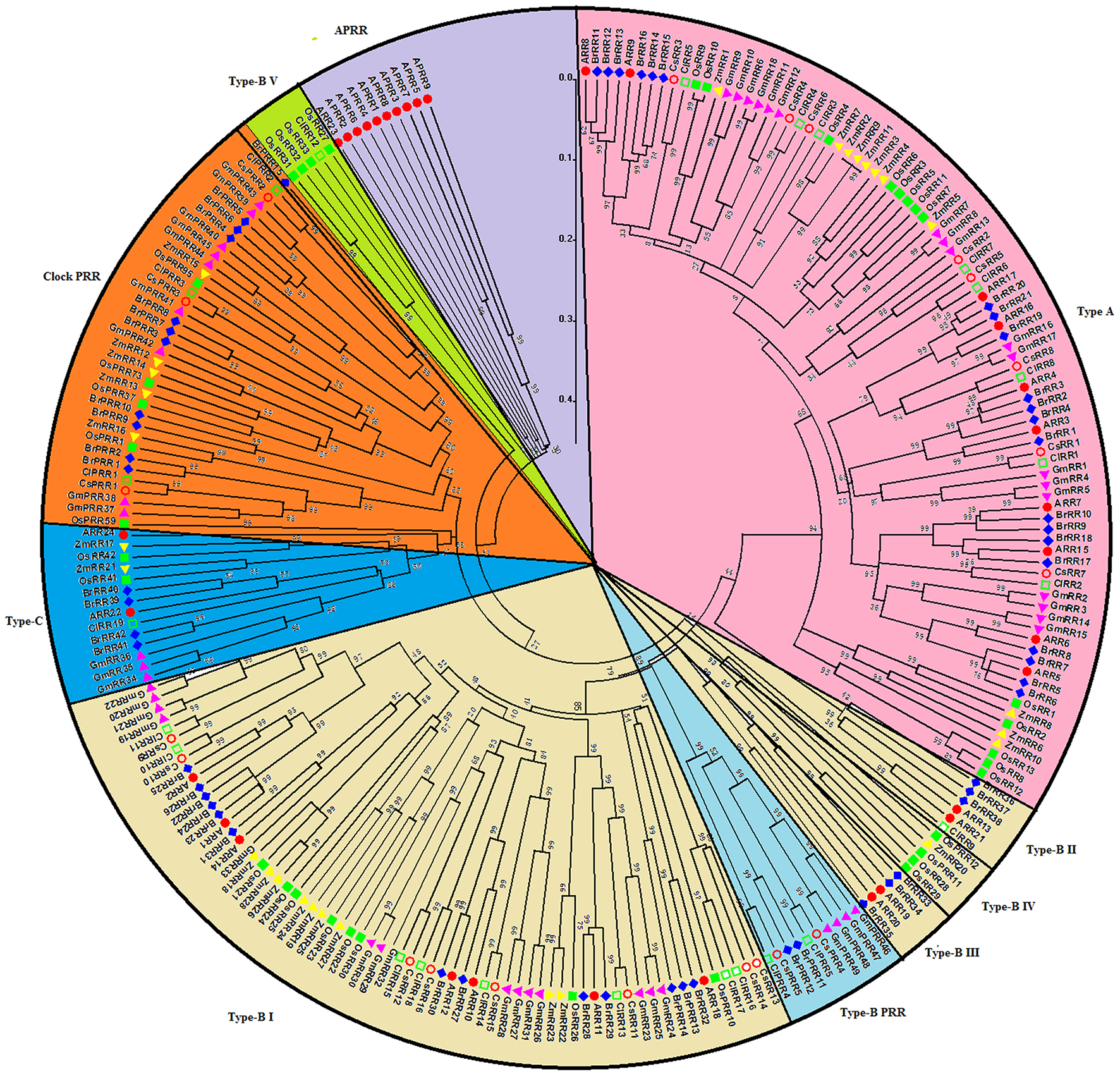 Phylogenetic relationship of RR proteins in Arabidopsis, rice, maize, Chinese cabbage, soybean, cucumber, and watermelon. For the details, see Figure 4.