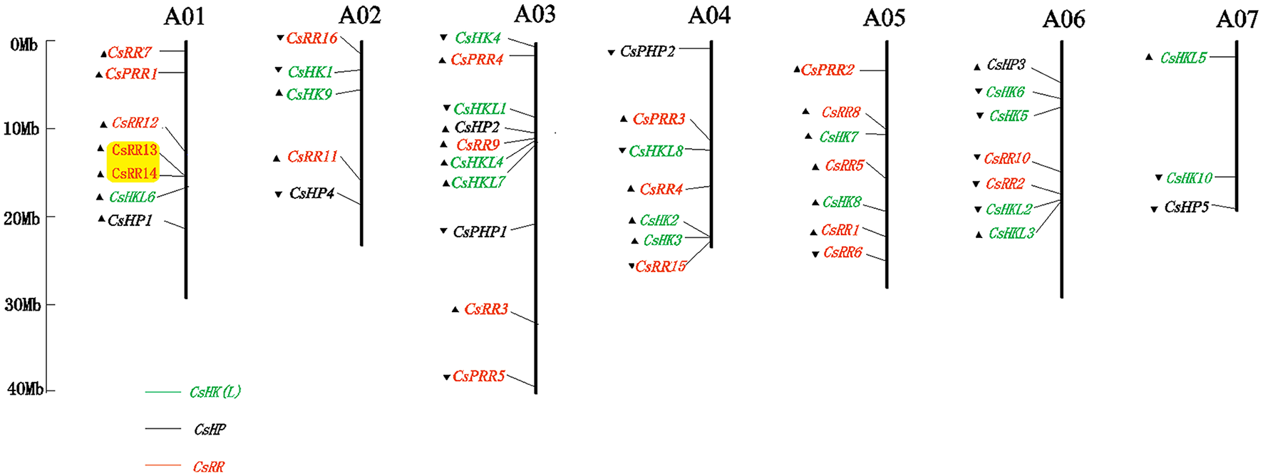 The local distribution of TCS elements was also explored by blast search on the Cucurbit Genomics Database (Figure 7). The 46 cucumber TCS genes were apparently unevenly distributed on the seven chromosomes. In detail, the 18 putative CsHKs were scattered throughout the seven chromosomes. The CsRRs and CsHPs were mapped on all the cucumber chromosomes except for Chr7 and Chr5, respectively. Similarly, 49 TCS genes in watermelon were non-randomly located on the watermelon genome (Figure S12). The ClHK genes were mapped on the 10 watermelon chromosomes except for Chr7. The ClHP genes were scattered on the Chr5, Chr6, Chr7, and Chr8, whereas the ClRRs were distributed on all the chromosomes, except for Chr2 and Chr3.