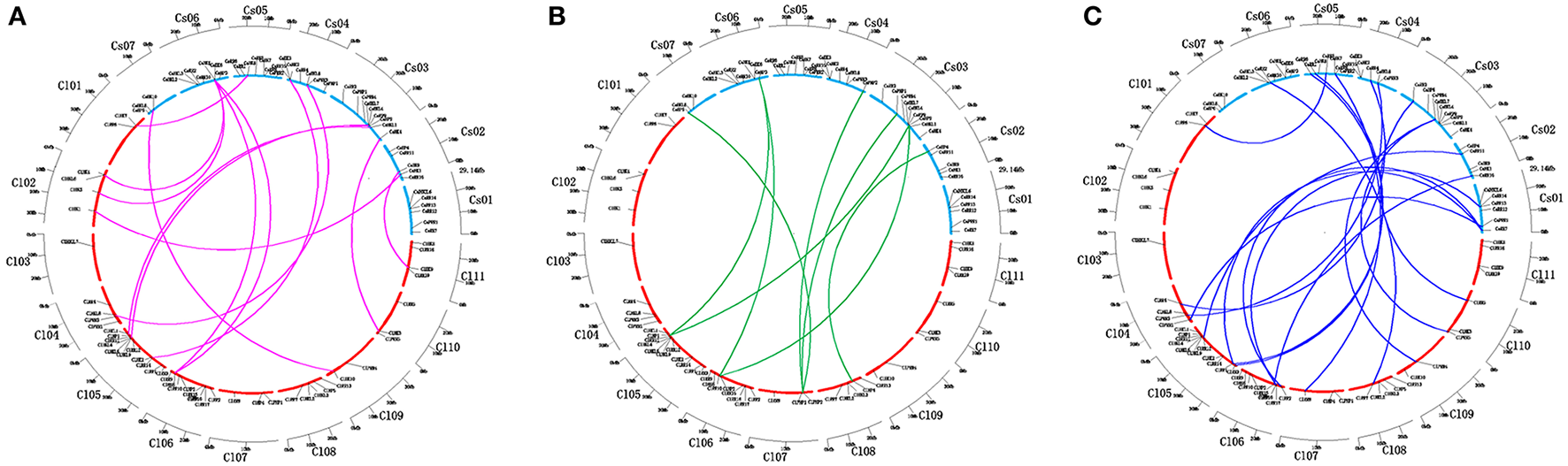 Relationship diagrams of syntenic TCS genes in chromosomal synteny regions distribution among cucumber and watermelon. Chromosomes of cucumber and watermelon are represented by blue and red arcs according to their own sizes. (A–C) Represent syntenic genes of HKs, HPs, and RRs in cucumber and watermelon are linked by red, green and blue lines respectively.