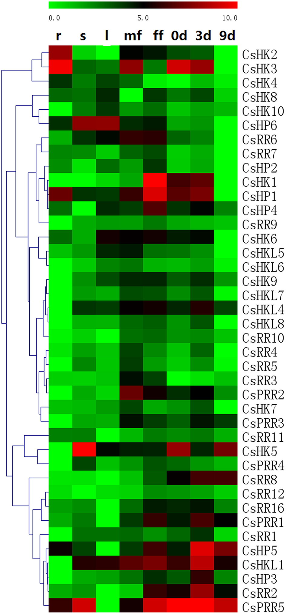 We performed qRT-PCR to detect the expression patterns of 40 cucumber TCS genes in different cucumber organs/tissues (Figure 9, Table S6). Some detected genes such as CsHK2-CsHK4, CsHP1, and CsPHP2 were relatively highly expressed in cucumber root. Especially, the transcript of CsPHP2 was only detected in the root. Similar expression characteristics were reported in Arabidopsis and Chinese cabbage (Liu et al., 2014). But almost all of cucumber TCS genes expressed highest in fruit, male or female flowers. In detail, most of genes namely, CsHK1/7/9, CsHKL5-8, CsHP1/2/4, CsRR3-7, CsRR9/10/12, and CsPRR2/3 were detected to express highest in male or female flowers, and they generally also have relatively high transcript levels in fruit at 3 DAP. But were hardly detected in root or 9 DAP fruit. Some genes such CsHKL1/4/8, CsHP3/5, CsRR1/2/7/11/16, and CsPRR1/5 expressed highest in fruit and they have similar expression patterns in fruit, peaked at 3 DAP fruit and then decreased at 9 DAP fruit during early fruit development. And these genes usually have higher mRNA levels in female flower than male flower, and are expressed at low level in root or leaves. CsHK1, which was homologous with Arabidopsis CKI1, was expressed almost exclusively in the female flower. Similarly, CKI1 is specifically expressed in Arabidopsis developing ovules and regulated female gametophyte development (Deng et al., 2010). Meanwhile, the mRNA levels of three ethylene receptors are relatively high in cucumber flower and fruit, and they have been verified to participate in the formation and development of female flower (Yamasaki et al., 2000, 2003; Wang et al., 2010). TCS members in Arabidopsis play important roles in regulating female gametophyte and fruit development (Marsch-MartÃnez et al., 2012). Similarly, some rice TCS genes are expressed predominantly in seeds compared with vegetative organs (Jain et al., 2008). Soybean GmHK01, GmHP02, GmRR17, and GmRR34 are especially expressed in inflorescence or seed tissues (Mochida et al., 2010). Some tomato TCS elements were verified to play important roles in regulation of tomato fruit ripening (Tieman et al., 2000; Pan et al., 2013; Gupta et al., 2014). These data suggested that TCS genes probably play significant roles in cucumber reproductive development.