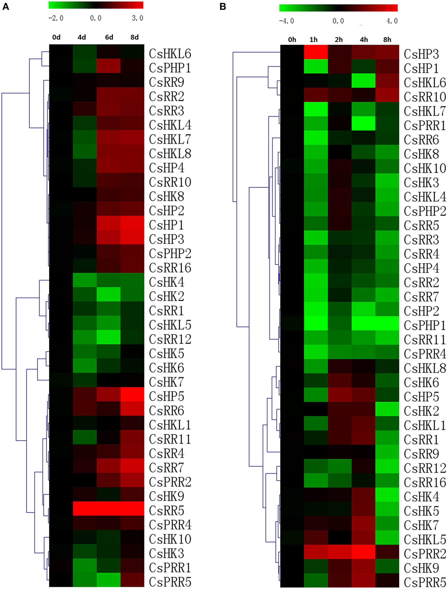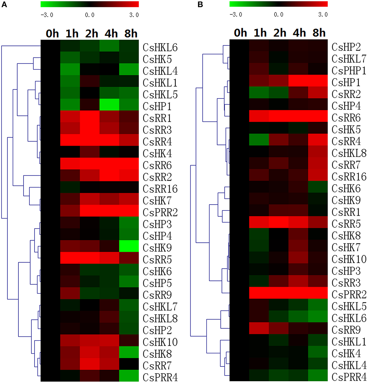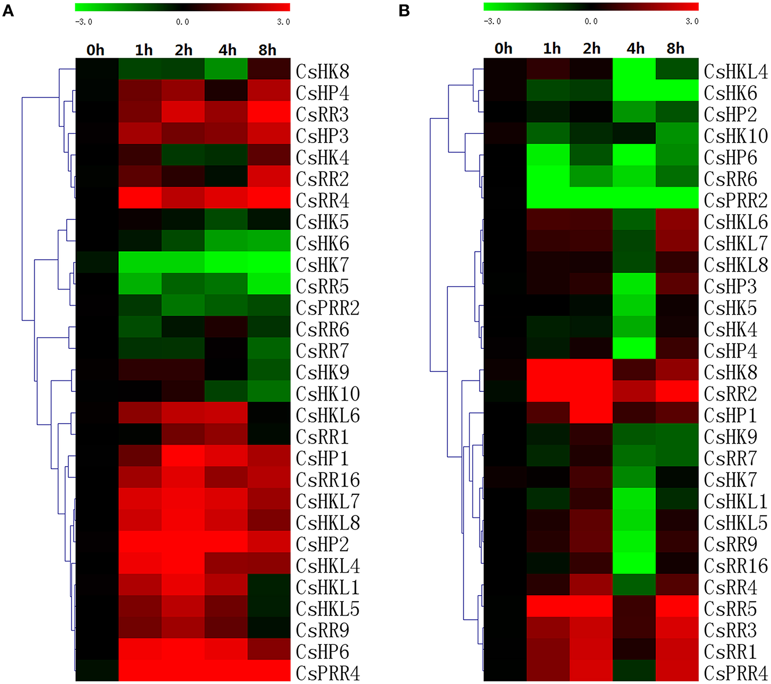 Heat map representation for the expression patterns in response to exogenous ZT (A) and ABA (B) of TCS genes in cucumber. Cucumber leaves were collected at 0, 1, 2, 4, and 8 h after 100 μM trans-zeatin or 100 μM ABA treatment. The heatmap was manufactured by MeV4.8. The color scale representing the relative expression values is shown in the upper left of the heatmap expressed in log2 scale.