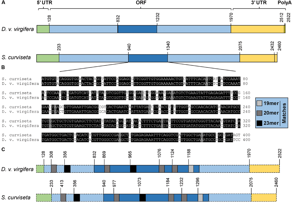The ORF of S. curviseta and D. v. vugifera shares 19 19-, 12 20-, six 21-, four 22-, and two 23-nt contiguous matches (Figure 1C, Supplementary Table S2). The conserved 400 bp region shares 12 19-, seven 20-, three 21-, two 22-, and one 23-nt contiguous matches (Figure 1C, Supplementary Table S2, highlighted in gray).