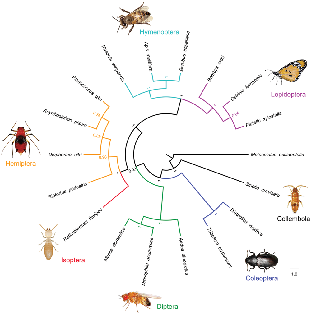 Phylogenetic analysis supports the sister relationship between S. curviseta (Collembola) and other insects (Insecta) based on v-ATPase A amino acid sequence using Bayesian analysis (PP = 1.0; Figure 2).