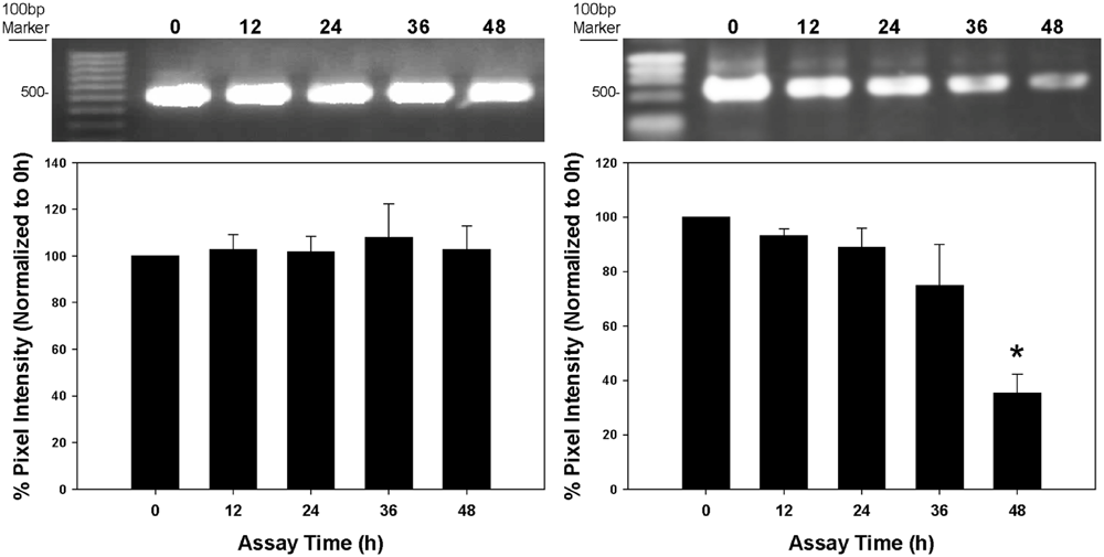 Percent (%) pixel intensity of the expected gel band was measured every 12 h across two assay days and normalized to 0 h time point. For diet without S. curiviseta, no significant degradation of v-ATPase A dsRNAs was observed [H(4) = 7.5462, P = 0.109, Figure 3]. Similarly, v-ATPase A dsRNAs was stable for the first 36 h in the presence of S. curiviseta, while it started to degrade by 48 h [H(4) = 14.230, P = 0.007, Figure 3]. This, however, should not impact the outcome because the diet was replaced every other day (at 48 h) for the duration of dietary RNAi toxicity assay.