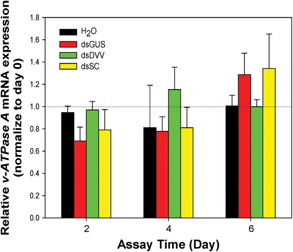 Temporal profile of v-ATPase A expression in S. curviseta. The expression profile of S. curviseta v-ATPase A was documented on days 2, 4, and 6. The relative expression of v-ATPase A transcripts was normalized to a reference gene 28S rRNA, and the transcription level of v-ATPase A in the 10-days-old untreated larvae were set to 1. See text for treatment details. Values are mean ± SE.